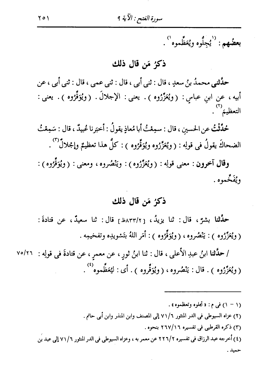 ذِكْرُ مَنْ قَالَ ذَلِكَ: حَدَّثَنَا بِشْرٌ، قَالَ: ثَنَا يَزِيدُ، قَالَ: ثَنَا سَعِيدٌ، عَنْ قَتَادَةَ، {§وَتُعَزِّرُوهُ} [الفتح: 9] يَنْصُرُوهُ {وَتُوَقِّرُوهُ} [الفتح: 9] «أَمَرَ اللَّهُ بِتَسْوِيدِهِ وَتَفْخِيمِهِ»