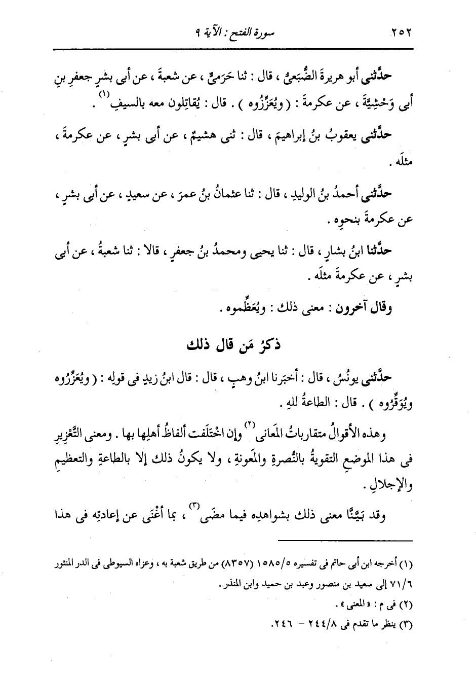 حَدَّثَنِي أَبُو هُرَيْرَةَ الضُّبَعِيُّ، قَالَ: ثَنَا حَرَمِيُّ، عَنْ شُعْبَةَ، عَنْ أَبِي بِشْرٍ جَعْفَرِ بْنِ أَبِي وَحْشِيَّةَ، عَنْ عِكْرِمَةَ، {§وَتُعَزِّرُوهُ} [الفتح: 9] قَالَ: «يُقَاتِلُونَ مَعَهُ بِالسَّيْفِ» حَدَّثَنِي يَعْقُوبُ بْنُ إِبْرَاهِيمَ، قَالَ: ثَنِي هُشَيْمُ، عَنْ أَبِي بِشْرٍ، عَنْ عِكْرِمَةَ، مِثْلَهُ حَدَّثَنِي أَحْمَدُ بْنُ الْوَلِيدِ، قَالَ: ثَنَا عُثْمَانُ بْنُ عُمَرَ، عَنْ سَعِيدٍ، عَنْ أَبِي بِشْرٍ، عَنْ عِكْرِمَةَ، بِنَحْوِهِ حَدَّثَنَا ابْنُ بَشَّارٍ، قَالَ: ثَنَا يَحْيَى وَمُحَمَّدُ بْنُ جَعْفَرٍ، قَالَا: ثَنَا شُعْبَةُ، عَنْ أَبِي بِشْرٍ، عَنْ عِكْرِمَةَ، مِثْلَهُ وَقَالَ آخَرُونَ: مَعْنَى ذَلِكَ: وَيُعَظِّمُوهُ