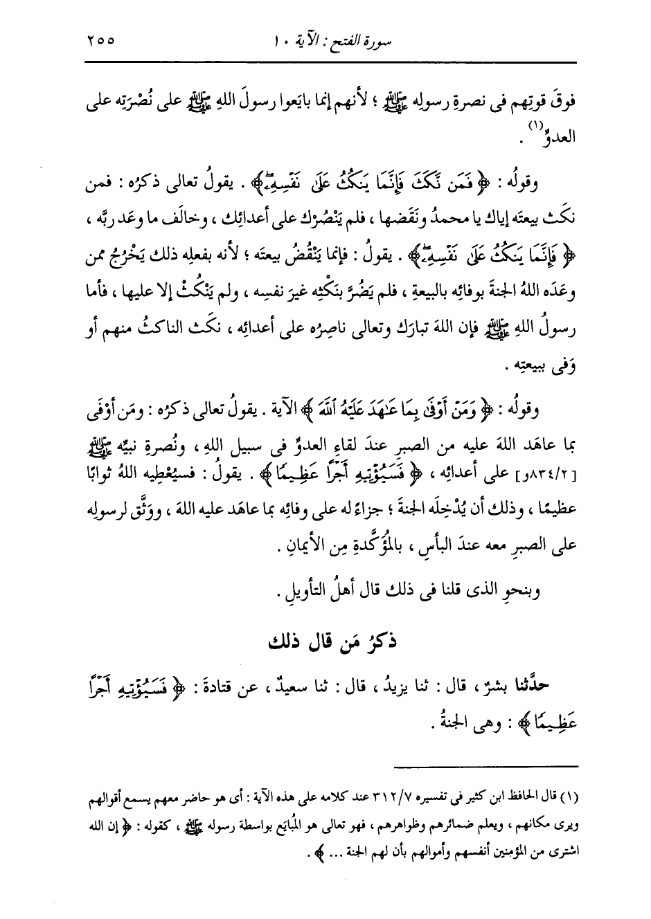ذِكْرُ مَنْ قَالَ ذَلِكَ: حَدَّثَنَا بِشْرٌ، قَالَ: ثَنَا يَزِيدُ، قَالَ: ثَنَا سَعِيدٌ، عَنْ قَتَادَةَ، {§فَسَيُؤْتِيهِ أَجْرًا عَظِيمًا} [الفتح: 10] «وَهِيَ الْجَنَّةُ»