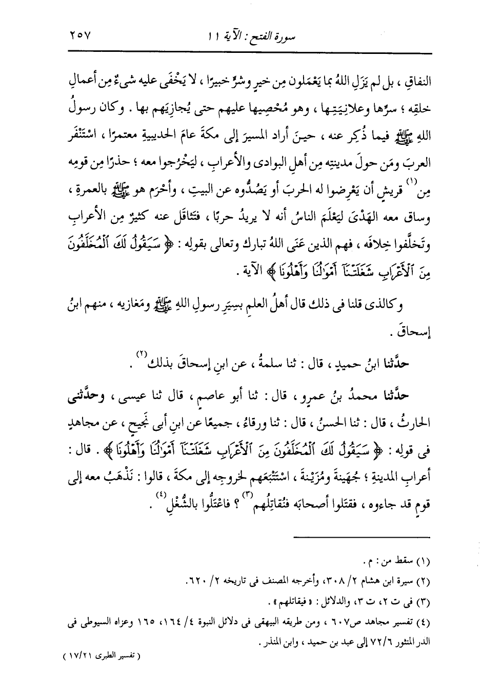 حَدَّثَنَا مُحَمَّدُ بْنُ عَمْرٍو، قَالَ: ثَنَا أَبُو عَاصِمٍ، قَالَ: ثَنَا عِيسَى، وَحَدَّثَنِي الْحَارِثُ، قَالَ: ثَنَا الْحَسَنُ، قَالَ: ثَنَا وَرْقَاءُ، جَمِيعًا، عَنِ ابْنِ أَبِي نَجِيحٍ، عَنْ مُجَاهِدٍ، فِي قَوْلِهِ: {§سَيَقُولُ لَكَ الْمُخَلَّفُونَ مِنَ الْأَعْرَابِ شَغَلَتْنَا أَمْوَالُنَا وَأَهْلُونَا} [الفتح: 11] قَالَ: " أَعْرَابُ الْمَدِينَةِ: جُهَيْنَةُ وَمُزَيْنَةُ، اسْتَتْبَعَهُمْ لِخُرُوجِهِ إِلَى مَكَّةَ، قَالُوا: نَذْهَبُ مَعَهُ إِلَى قَوْمٍ قَدْ جَاءُوهُ، فَقَتَلُوا أَصْحَابَهُ فَنُقَاتِلُهُمْ فَاعْتَلُّوا بِالشُّغْلِ " -[258]- وَاخْتَلَفَتِ الْقُرَّاءُ فِي قِرَاءَةِ قَوْلِهِ: {إِنْ أَرَادَ بِكُمْ ضَرًّا} [الفتح: 11] فَقَرَأَتْهُ قُرَّاءُ الْمَدِينَةِ وَالْبَصْرَةِ وَبَعْضُ قُرَّاءِ الْكُوفَةِ {ضَرًّا} [المائدة: 76] بِفَتْحِ الضَّادِ، بِمَعْنَى: الضُّرِّ الَّذِي هُوَ خِلَافُ النَّفْعِ وَقَرَأَ ذَلِكَ عَامَّةُ قُرَّاءِ الْكُوفِيِّينَ (ضُرًّا) بِضَمِّ الضَّادِ، بِمَعْنَى الْبُؤْسِ وَالسَّقَمِ وَأَعْجَبُ الْقِرَاءَتَيْنِ إِلَيَّ الْفَتْحُ فِي الضَّادِ فِي هَذَا الْمَوْضِعِ بِقَوْلِهِ: {أَوْ أَرَادَ بِكُمْ نَفْعًا} [الفتح: 11] فَمَعْلُومٌ أَنَّ خِلَافَ النَّفْعِ الضُّرَّ، وَإِنْ كَانَتِ الْأُخْرَى صَحِيحًا مَعْنَاهَا