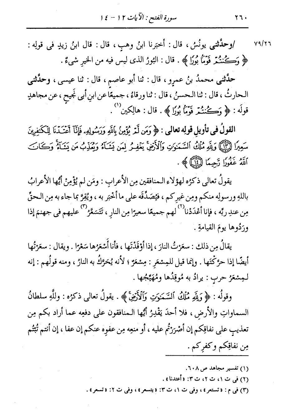 حَدَّثَنِي مُحَمَّدُ بْنُ عَمْرٍو، قَالَ: ثَنَا أَبُو عَاصِمٍ، قَالَ: ثَنَا عِيسَى، وَحَدَّثَنِي الْحَارِثُ، قَالَ: ثَنَا الْحَسَنُ، قَالَ: ثَنَا وَرْقَاءُ، جَمِيعًا، عَنِ ابْنِ أَبِي نَجِيحٍ، عَنْ مُجَاهِدٍ، قَوْلَهُ: {§وَكُنْتُمْ قَوْمًا بُورًا} [الفتح: 12] قَالَ: «هَالِكِينَ»