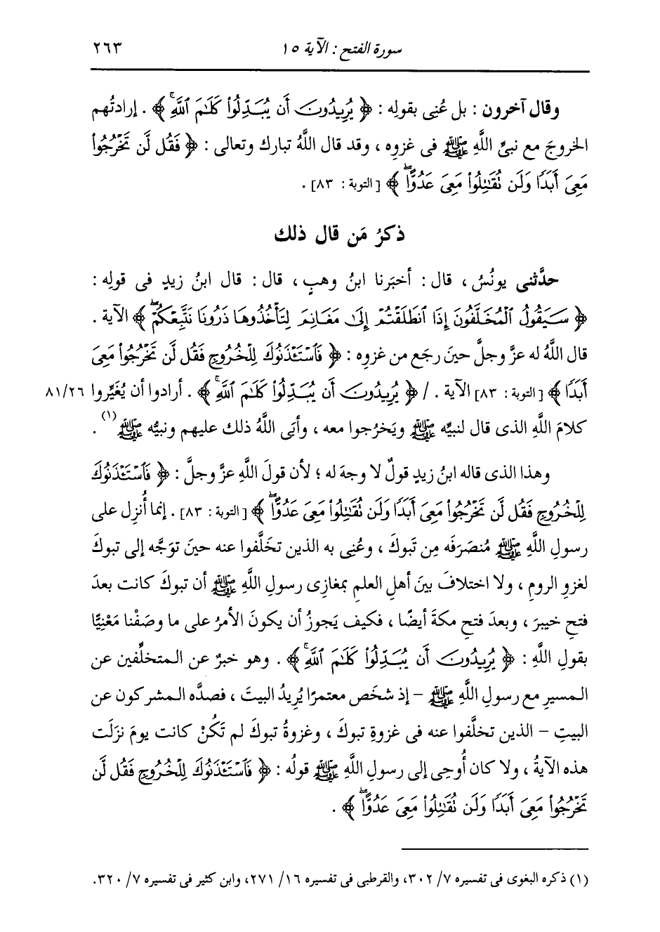 ذِكْرُ مَنْ قَالَ ذَلِكَ: حَدَّثَنِي يُونُسُ، قَالَ: أَخْبَرَنَا ابْنُ وَهْبٍ، قَالَ: قَالَ ابْنُ زَيْدٍ، فِي قَوْلِهِ: {§سَيَقُولُ الْمُخَلَّفُونَ إِذَا انْطَلَقْتُمْ إِلَى مَغَانِمَ لِتَأْخُذُوهَا ذَرُونَا نَتَّبِعْكُمْ} [الفتح: 15] الْآيَةَ، «قَالَ اللَّهُ عَزَّ وَجَلَّ حِينَ رَجَعَ مِنْ غَزْوِهِ» ، {فَاسْتَأْذَنُوكَ لِلْخُرُوجِ فَقُلْ لَنْ تَخْرُجُوا مَعِيَ أَبَدًا وَلَنْ تُقَاتِلُوا مَعِي عَدُوًّا} [التوبة: 83] الْآيَةَ " يُرِيدُونَ أَنْ يُبَدِّلُوا كَلَامَ اللَّهِ: أَرَادُوا أَنْ يُغَيِّرُوا كَلَامَ اللَّهِ الَّذِي قَالَ لِنَبِيِّهِ صَلَّى اللهُ عَلَيْهِ وَسَلَّمَ وَيَخْرُجُوا مَعَهُ، وَأَبَى اللَّهُ ذَلِكَ عَلَيْهِمْ وَنَبِيُّهُ صَلَّى اللهُ عَلَيْهِ وَسَلَّمَ " وَهَذَا الَّذِي قَالَهُ ابْنُ زَيْدٍ قَوْلٌ لَا وَجْهَ لَهُ، لِأَنَّ قَوْلَ اللَّهِ عَزَّ وَجَلَّ {فَاسْتَأْذَنُوكَ لِلْخُرُوجِ فَقُلْ لَنْ تَخْرُجُوا مَعِيَ أَبَدًا وَلَنْ تُقَاتِلُوا مَعِي عَدُوًّا} [التوبة: 83] إِنَّمَا نَزَلَ عَلَى رَسُولِ اللَّهِ صَلَّى اللهُ عَلَيْهِ وَسَلَّمَ مُنْصَرَفَهُ مِنْ تَبُوكَ، وَعَنَى بِهِ الَّذِينَ تَخَلَّفُوا عَنْهُ حِينَ تَوَجَّهَ إِلَى تَبُوكَ لِغَزْوِ الرُّومِ، وَلَا اخْتِلَافَ بَيْنَ أَهْلِ الْعِلْمِ بِمَغَازِي رَسُولِ اللَّهِ صَلَّى اللهُ عَلَيْهِ وَسَلَّمَ أَنَّ تَبُوكَ كَانَتْ بَعْدَ فَتْحِ خَيْبَرَ وَبَعْدَ فَتْحِ مَكَّةَ أَيْضًا، فَكَيْفَ يَجُوزُ أَنْ يَكُونَ الْأَمْرُ عَلَى مَا وَصَفْنَا مَعْنِيًّا بِقَوْلِ اللَّهِ: {يُرِيدُونَ أَنْ يُبَدِّلُوا كَلَامَ اللَّهِ} [الفتح: 15] وَهُوَ خَبَرٌ عَنِ الْمُتَخَلِّفِينَ عَنِ الْمَسِيرِ مَعَ رَسُولِ اللَّهِ صَلَّى اللهُ عَلَيْهِ وَسَلَّمَ، إِذْ شَخَصَ مُعْتَمِرًا يُرِيدُ الْبَيْتَ، فَصَدَّهُ الْمُشْرِكُونَ عَنِ الْبَيْتِ، الَّذِينَ تَخَلَّفُوا عَنْهُ فِي غَزْوَةِ تَبُوكَ، وَغَزْوَةُ تَبُوكَ لَمْ تَكُنْ كَانَتْ يَوْمَ نَزَلَتْ هَذِهِ الْآيَةُ، وَلَا كَانَ أُوحِيَ إِلَى رَسُولِ اللَّهِ صَلَّى اللهُ عَلَيْهِ وَسَلَّمَ قَوْلُهُ: {فَاسْتَأْذَنُوكَ لِلْخُرُوجِ فَقُلْ لَنْ تَخْرُجُوا مَعِيَ أَبَدًا وَلَنْ تُقَاتِلُوا مَعِي عَدُوًّا} [التوبة: 83]