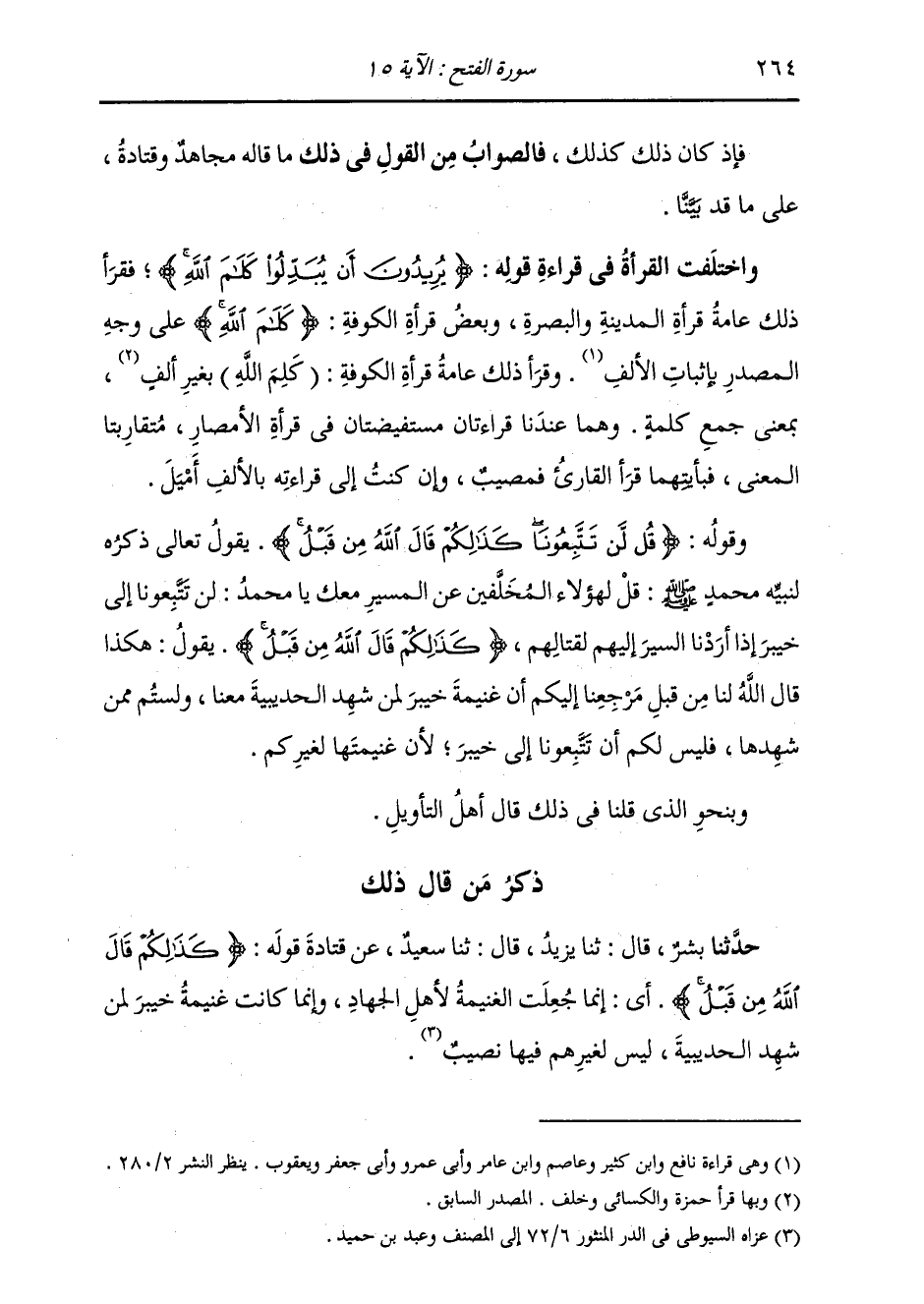ذِكْرُ مَنْ قَالَ ذَلِكَ: حَدَّثَنَا بِشْرٌ، قَالَ: ثَنَا يَزِيدُ، قَالَ: ثَنَا سَعِيدٌ، عَنْ قَتَادَةَ، قَوْلَهُ: {§كَذَلِكُمْ قَالَ اللَّهُ مِنْ قَبْلُ} [الفتح: 15] «أَيْ إِنَّمَا جُعِلَتِ الْغَنِيمَةُ لِأَهْلِ الْجِهَادِ، وَإِنَّمَا كَانَتْ غَنِيمَةُ خَيْبَرَ لِمَنْ شَهِدَ الْحُدَيْبِيَةَ لَيْسَ لِغَيْرِهِمْ فِيهَا نَصِيبٌ»