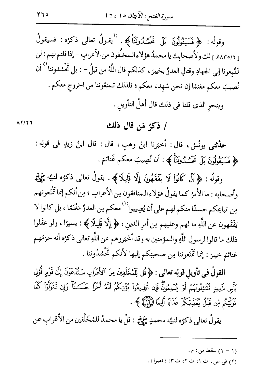 ذِكْرُ مَنْ قَالَ ذَلِكَ: حَدَّثَنِي يُونُسُ، قَالَ: أَخْبَرَنَا ابْنُ وَهْبٍ، قَالَ: قَالَ ابْنُ زَيْدٍ، فِي قَوْلِهِ: {§فَسَيَقُولُونَ بَلْ تَحْسُدُونَنَا} [الفتح: 15] «أَنْ نُصِيبَ مَعَكُمْ غَنَائِمَ»