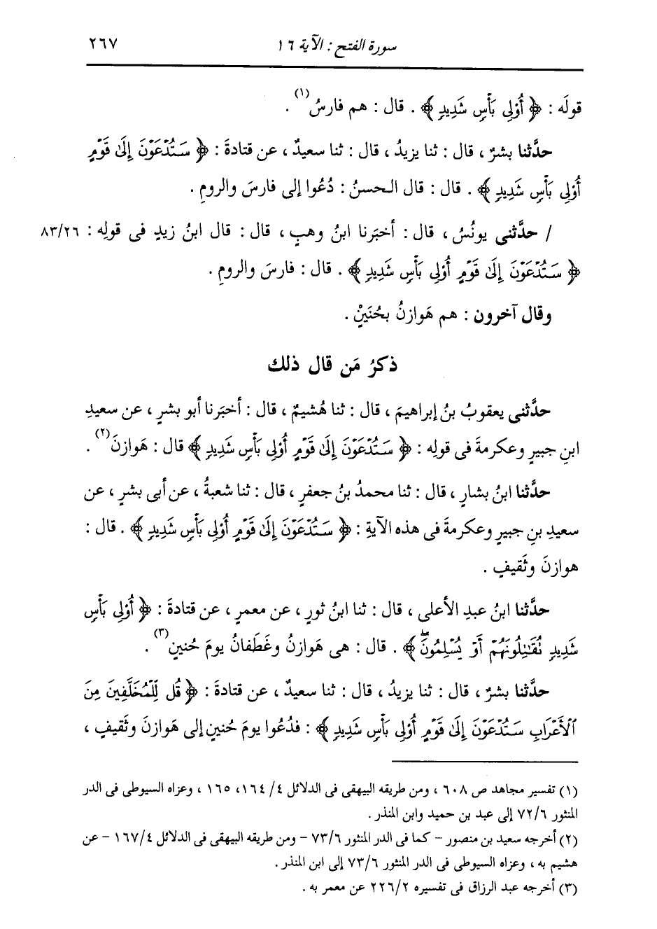 حَدَّثَنَا ابْنُ عَبْدِ الْأَعْلَى، قَالَ: ثَنَا ابْنُ ثَوْرٍ، عَنْ مَعْمَرٍ، عَنْ قَتَادَةَ، {§أُولِي بَأْسٍ شَدِيدٍ تُقَاتِلُونَهُمْ أَوْ يُسْلِمُونَ} [الفتح: 16] قَالَ: «هِيَ هَوَازِنُ وَغَطَفَانُ يَوْمَ حُنَيْنٍ»