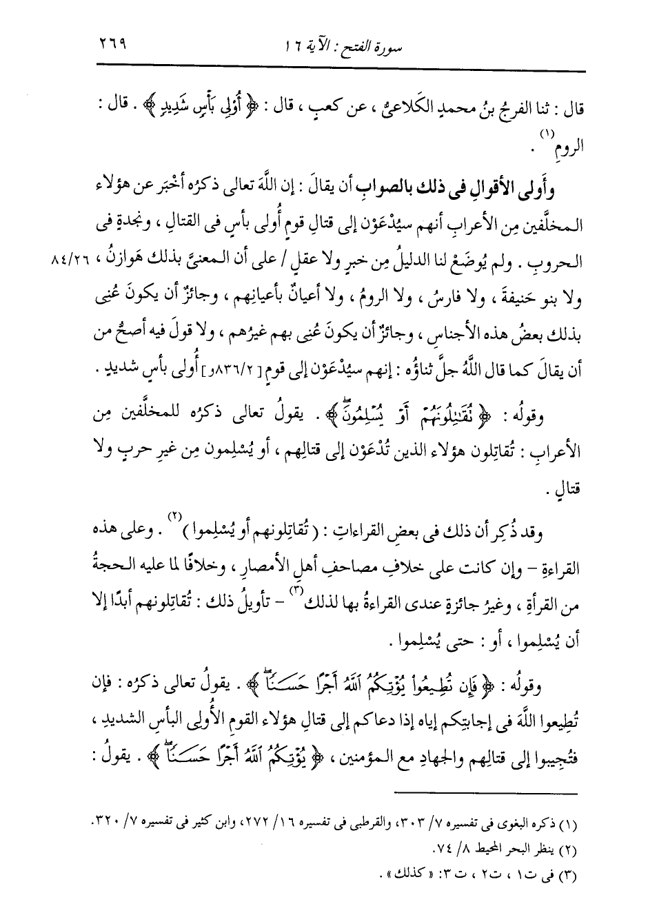 §وَقَوْلُهُ: {تُقَاتِلُونَهُمْ أَوْ يُسْلِمُونَ} [الفتح: 16] يَقُولُ تَعَالَى ذِكْرُهُ لِلْمُخَلَّفِينَ مِنَ الْأَعْرَابِ تُقَاتِلُونَ هَؤُلَاءِ الَّذِينَ تُدْعَوْنَ إِلَى قِتَالِهِمْ، أَوْ يُسْلِمُونَ مِنْ غَيْرِ حَرْبٍ وَلَا قِتَالٍ وَقَدْ ذُكِرَ أَنَّ ذَلِكَ فِي بَعْضِ الْقِرَاءَاتِ «تُقَاتِلُونَهُمْ أَوْ يُسْلِمُوا» ، وَعَلَى هَذِهِ الْقِرَاءَةِ وَإِنْ كَانَتْ عَلَى خِلَافِ مَصَاحِفِ أَهْلِ الْأَمْصَارِ، وَخِلَافًا لِمَا عَلَيْهِ الْحُجَّةُ مِنَ الْقُرَّاءِ، وَغَيْرُ جَائِزٍ عِنْدِي الْقِرَاءَةُ بِهَا لِذَلِكَ تَأْوِيلُ ذَلِكَ: تُقَاتِلُونَهُمْ أَبَدًا إِلَّا أَنْ يُسْلِمُوا، أَوْ حَتَّى يُسْلِمُوا