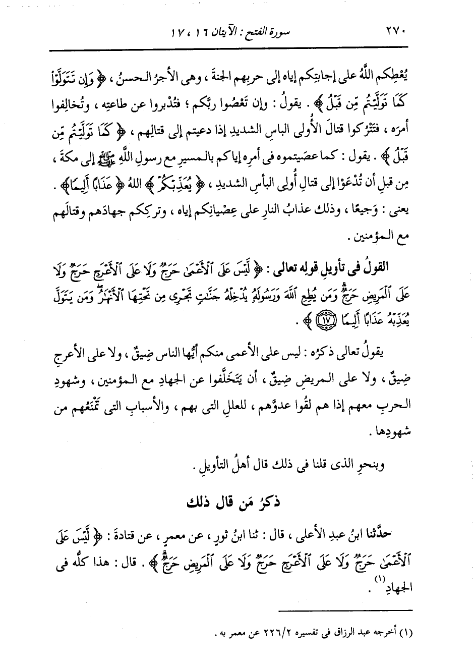 ذِكْرُ مَنْ قَالَ ذَلِكَ: حَدَّثَنَا ابْنُ عَبْدِ الْأَعْلَى، قَالَ: ثَنَا ابْنُ ثَوْرٍ، عَنْ مَعْمَرٍ، عَنْ قَتَادَةَ، {§لَيْسَ عَلَى الْأَعْمَى حَرَجٌ وَلَا عَلَى الْأَعْرَجِ حَرَجٌ وَلَا عَلَى الْمَرِيضِ حَرَجٌ} [الفتح: 17] قَالَ: «هَذَا كُلُّهُ فِي الْجِهَادِ»