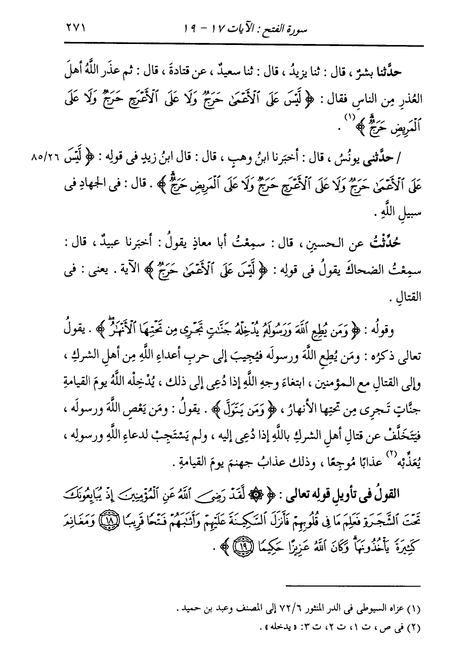 حَدَّثَنَا بِشْرٌ، قَالَ: ثَنَا يَزِيدُ، قَالَ: ثَنَا سَعِيدٌ، عَنْ قَتَادَةَ، قَالَ: " ثُمَّ §عَذَرَ اللَّهُ أَهْلَ الْعُذْرِ مِنَ النَّاسِ، فَقَالَ: {لَيْسَ عَلَى الْأَعْمَى حَرَجٌ وَلَا عَلَى الْأَعْرَجِ حَرَجٌ وَلَا عَلَى الْمَرِيضِ حَرَجٌ} [الفتح: 17] "