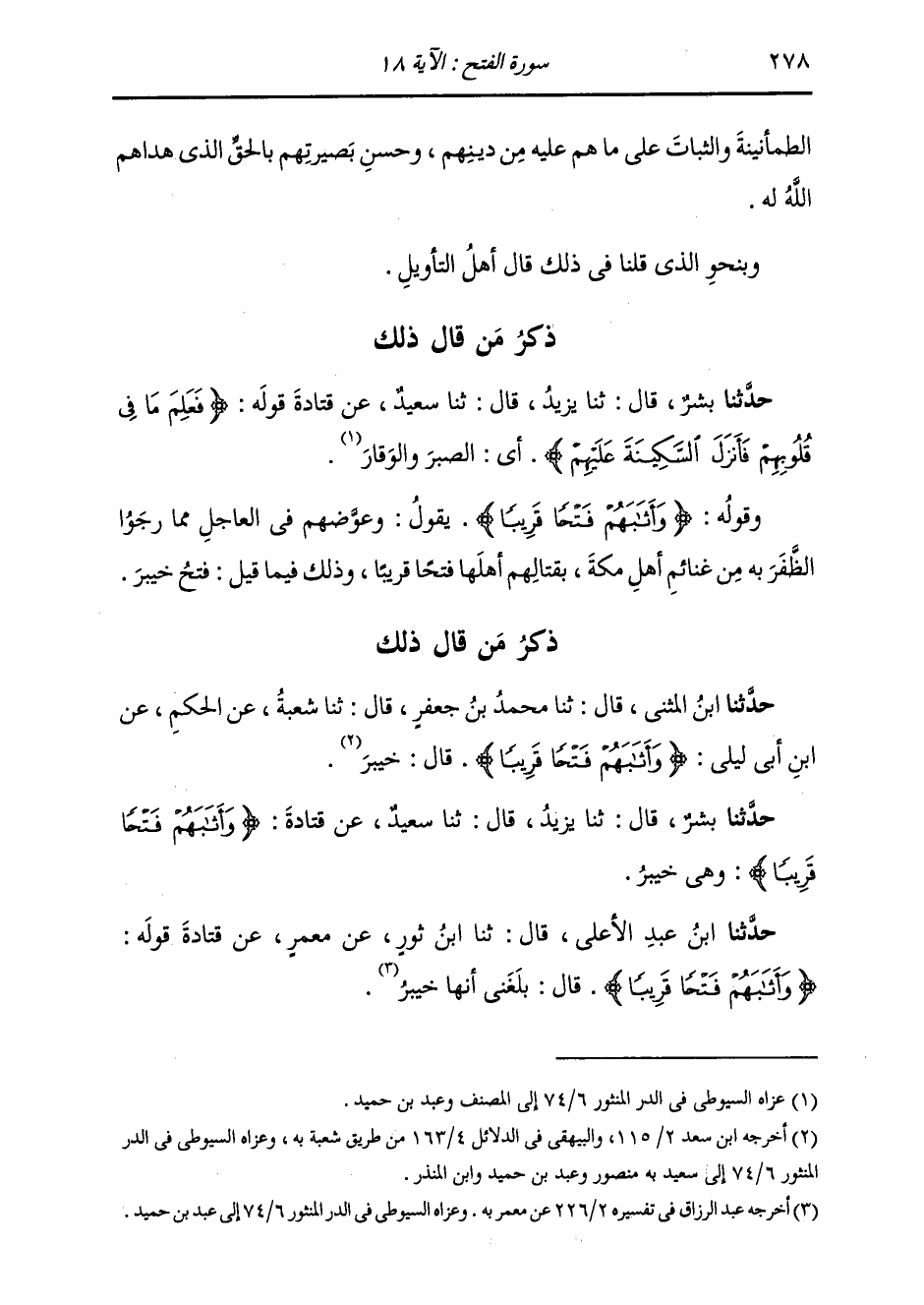 ذِكْرُ مَنْ قَالَ ذَلِكَ: حَدَّثَنَا بِشْرٌ، قَالَ: ثَنَا يَزِيدُ، قَالَ: ثَنَا سَعِيدٌ، عَنْ قَتَادَةَ، قَوْلَهُ {§فَعَلِمَ مَا فِي قُلُوبِهِمْ فَأَنْزَلَ السَّكِينَةَ عَلَيْهِمْ} [الفتح: 18] «أَيِ الصَّبْرُ وَالْوَقَارُ»