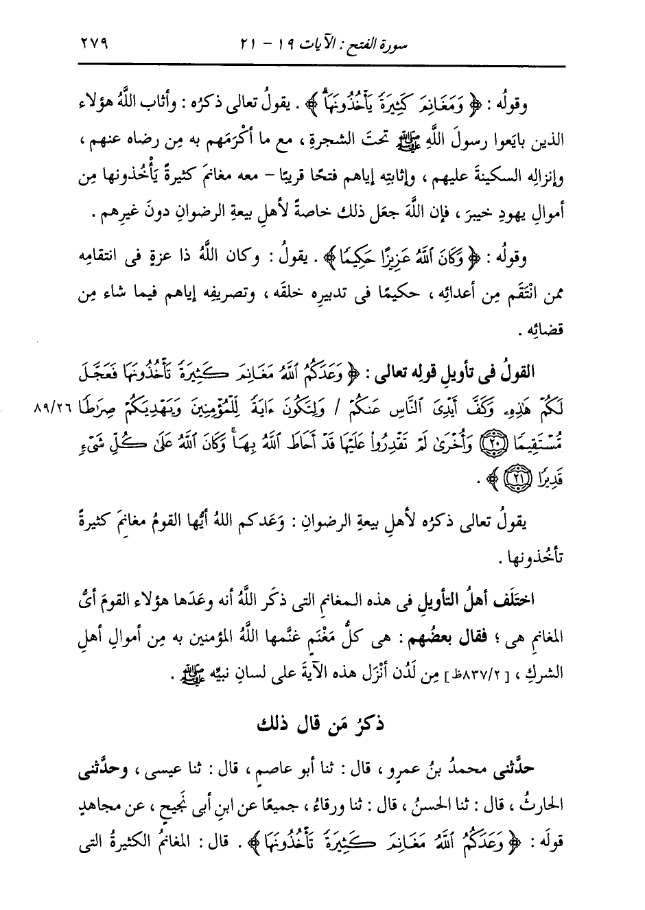§الْقَوْلُ فِي تَأْوِيلِ قَوْلِهِ تَعَالَى: {وَعَدَكُمُ اللَّهُ مَغَانِمَ كَثِيرَةً تَأْخُذُونَهَا فَعَجَّلَ لَكُمْ هَذِهِ وَكَفَّ أَيْدِيَ النَّاسِ عَنَكُمْ وَلِتَكُونَ آيَةً لِّلْمُؤْمِنِينَ وَيَهْدِيَكُمْ صِرَاطًا مُّسْتَقِيمًا وَأُخْرَى لَمْ تَقْدِرُوا عَلَيْهَا قَدْ أَحَاطَ اللَّهُ بِهَا وَكَانَ اللَّهُ عَلَى كُلِّ شَيْءٍ قَدِيرًا} [الفتح: 21] يَقُولُ تَعَالَى ذِكْرُهُ لِأَهْلِ بَيْعَةِ الرِّضْوَانِ: {وَعَدَكُمُ اللَّهُ} [الفتح: 20] أَيُّهَا الْقَوْمُ {مَغَانِمَ كَثِيرَةً تَأْخُذُونَهَا} [الفتح: 20] اخْتَلَفَ أَهْلُ التَّأْوِيلِ فِي هَذِهِ الْمَغَانِمِ الَّتِي ذَكَرَ اللَّهُ أَنَّهُ وَعَدَهَا هَؤُلَاءِ الْقَوْمَ أَيُّ الْمَغَانِمِ هِيَ، فَقَالَ بَعْضُهُمْ: هِيَ كُلُّ مَغْنَمٍ غَنَمِهَا اللَّهُ الْمُؤْمِنِينَ بِهِ مِنْ أَمْوَالِ أَهْلِ الشِّرْكِ مِنْ لَدُنْ أَنْزَلَ هَذِهِ الْآيَةَ عَلَى لِسَانِ نَبِيِّهِ صَلَّى اللهُ عَلَيْهِ وَسَلَّمَ