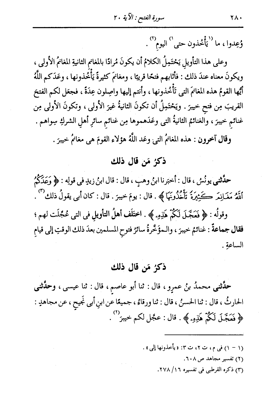 ذِكْرُ مَنْ قَالَ ذَلِكَ: حَدَّثَنِي مُحَمَّدُ بْنُ عَمْرٍو، قَالَ: ثَنَا أَبُو عَاصِمٍ، قَالَ: ثَنَا عِيسَى، وَحَدَّثَنِي الْحَارِثُ، قَالَ: ثَنَا الْحَسَنُ، قَالَ: ثَنَا وَرْقَاءُ، جَمِيعًا، عَنِ ابْنِ أَبِي نَجِيحٍ، عَنْ مُجَاهِدٍ، {§فَعَجَّلَ لَكُمْ هَذِهِ} [الفتح: 20] قَالَ: «عَجَّلَ لَكُمْ خَيْبَرَ»