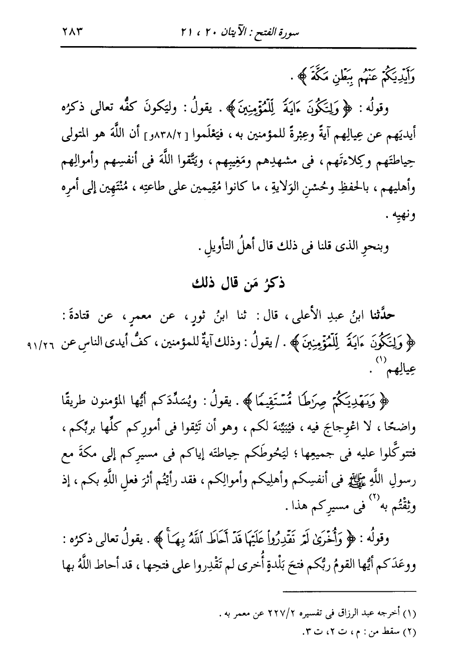 {§وَيَهْدِيَكُمْ صِرَاطًا مُسْتَقِيمًا} [الفتح: 20] يَقُولُ: وَيُسَدِّدُكُمْ أَيُّهَا الْمُؤْمِنُونَ طَرِيقًا وَاضِحًا لَا اعْوِجَاجَ فِيهِ، فَيُبَيِّنُهُ لَكُمْ، وَهُوَ أَنْ تَثِقُوا فِي أُمُورِكُمْ كُلِّهَا بِرَبِّكُمْ، فَتَتَوَكَّلُوا عَلَيْهِ فِي جَمِيعِهَا، لِيَحُوطَكُمْ حِيَاطَتَهُ إِيَّاكُمْ فِي مَسِيرِكُمْ إِلَى مَكَّةَ مَعَ رَسُولِ اللَّهِ صَلَّى اللهُ عَلَيْهِ وَسَلَّمَ فِي أَنْفُسِكُمْ وَأَهْلِيكُمْ وَأَمْوَالِكُمْ، فَقَدْ رَأَيْتُمْ أَثَرَ فِعْلِ اللَّهِ بِكُمْ، إِذْ وَثِقْتُمْ فِي مَسِيرِكُمْ هَذَا