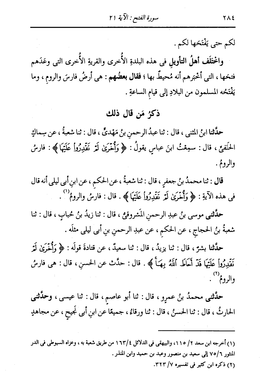 قَالَ: ثَنَا مُحَمَّدُ بْنُ جَعْفَرٍ، قَالَ: ثَنَا شُعْبَةُ، عَنِ الْحَكَمِ، عَنِ ابْنِ أَبِي لَيْلَى، أَنَّهُ قَالَ فِي هَذِهِ الْآيَةِ: {§وَأُخْرَى لَمْ تَقْدِرُوا عَلَيْهَا} [الفتح: 21] قَالَ: «فَارِسُ وَالرُّومُ» حَدَّثَنِي مُوسَى بْنُ عَبْدِ الرَّحْمَنِ الْمَسْرُوقِيُّ، قَالَ: ثَنَا زَيْدُ بْنُ حُبَابٍ، قَالَ: ثَنَا شُعْبَةُ بْنُ الْحَجَّاجِ، عَنِ الْحَكَمِ، عَنْ عَبْدِ الرَّحْمَنِ بْنِ أَبِي لَيْلَى مِثْلَهُ