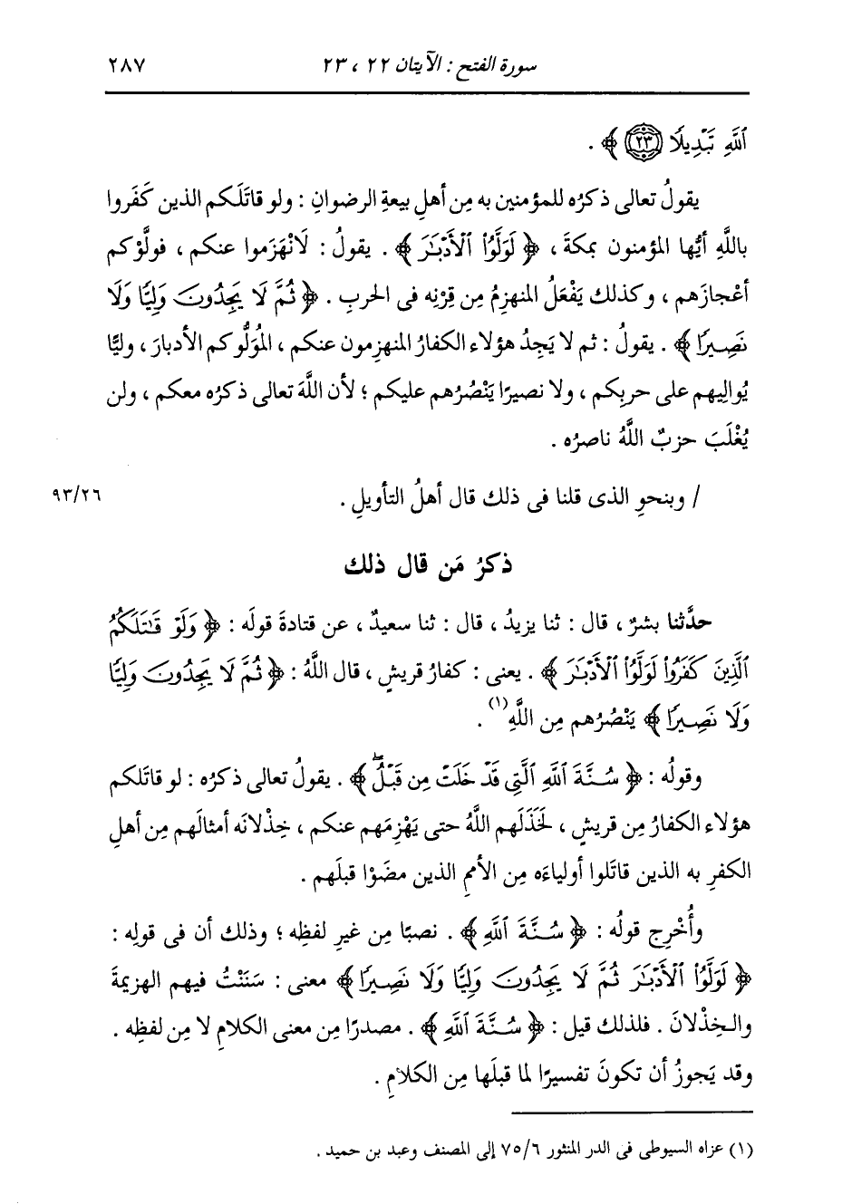 §وَقَوْلُهُ: {سُنَّةَ اللَّهِ الَّتِي قَدْ خَلَتْ مِنْ قَبْلُ} [الفتح: 23] يَقُولُ تَعَالَى ذِكْرُهُ: لَوْ قَاتَلَكُمْ هَؤُلَاءِ الْكُفَّارُ مِنْ قُرَيْشٍ، لَخَذَلَهُمُ اللَّهُ حَتَّى يُهْزِمَهُمْ عَنْكُمْ خُذْلَانَهُ أَمْثَالَهُمْ مِنْ أَهْلِ الْكُفْرِ بِهِ، الَّذِينَ قَاتَلُوا أَوْلِيَاءَهُ مِنَ الْأُمَمِ الَّذِينَ مَضَوْا قَبْلَهُمْ وَأَخْرَجَ قَوْلَهُ: {سُنَّةَ اللَّهِ} [الأحزاب: 38] نَصْبًا مِنْ غَيْرِ لَفْظِهِ، وَذَلِكَ أَنَّ فِي قَوْلِهِ: {لَوَلَّوُا الْأَدْبَارَ ثُمَّ لَا يَجِدُونَ وَلِيًّا وَلَا نَصِيرًا} [الفتح: 22] مَعْنَى سَنَنْتُ فِيهِمُ الْهَزِيمَةَ وَالْخُذْلَانَ، فَلِذَلِكَ قِيلَ: {سُنَّةَ اللَّهِ} [الأحزاب: 38] مَصْدَرًا مِنْ مَعْنَى الْكَلَامِ لَا مِنْ لَفْظِهِ، وَقَدْ يَجُوزُ أَنْ تَكُونَ تَفْسِيرًا لِمَا قَبْلَهَا مِنَ الْكَلَامِ