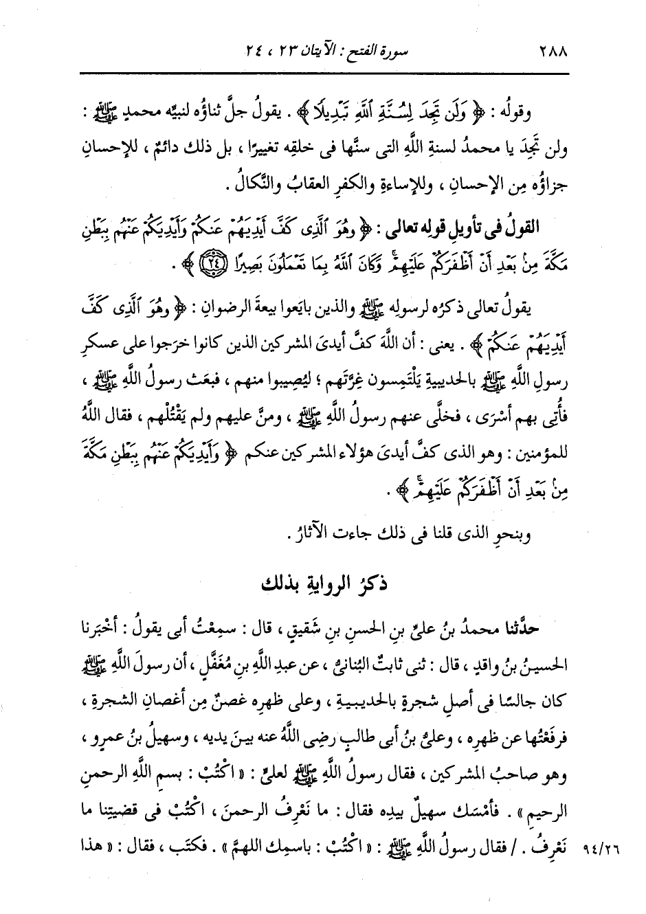 ذِكْرُ الرِّوَايَةِ بِذَلِكَ: حَدَّثَنَا مُحَمَّدُ بْنُ عَلِيِّ بْنِ الْحَسَنِ بْنِ شَقِيقٍ، قَالَ: سَمِعْتُ أَبِي يَقُولُ، أَخْبَرَنَا الْحُسَيْنُ بْنُ وَاقِدٍ، قَالَ: ثَنِي ثَابِتٌ الْبُنَانِيُّ، عَنْ عَبْدِ اللَّهِ بْنِ مُغَفَّلٍ، أَنَّ رَسُولَ اللَّهِ صَلَّى اللهُ عَلَيْهِ وَسَلَّمَ كَانَ جَالِسًا فِي أَصْلِ شَجَرَةٍ بِالْحُدَيْبِيَةِ، وَعَلَى ظَهْرِهِ غُصْنٌ مِنْ أَغْصَانِ الشَّجَرَةِ فَرَفَعْتُهَا عَنْ ظَهْرِهِ، وَعَلِيُّ بْنُ أَبِي طَالِبٍ رَضِيَ اللَّهُ عَنْهُ بَيْنَ يَدَيْهِ وَسُهَيْلُ بْنُ عَمْرٍو، وَهُوَ صَاحِبُ الْمُشْرِكِينَ، فَقَالَ رَسُولُ اللَّهِ صَلَّى اللهُ عَلَيْهِ وَسَلَّمَ لِعَلِيٍّ: «اكْتُبْ بِسْمِ اللَّهِ الرَّحْمَنِ الرَّحِيمِ» ، فَأَمْسَكَ سُهَيْلٌ بِيَدِهِ، فَقَالَ: مَا نَعْرِفُ الرَّحْمَنَ، اكْتُبْ فِي قَضِيَّتِنَا مَا نَعْرِفُ فَقَالَ رَسُولُ اللَّهِ: «اكْتُبْ بِاسْمِكَ اللَّهُمَّ» ، فَكَتَبَ، فَقَالَ: «هَذَا -[289]- مَا صَالَحَ مُحَمَّدٌ رَسُولُ اللَّهِ أَهْلَ مَكَّةَ» ، فَأَمْسَكَ سُهَيْلٌ بِيَدِهِ، فَقَالَ: لَقَدْ ظَلَمْنَاكَ إِنْ كُنْتَ رَسُولًا، اكْتُبْ فِي قَضِيَّتِنَا مَا نَعْرِفُ قَالَ: «اكْتُبْ هَذَا مَا صَالَحَ عَلَيْهِ مُحَمَّدُ بْنُ عَبْدِ اللَّهِ بْنِ عَبْدِ الْمُطَّلِبِ وَأَنَا رَسُولُ اللَّهِ» ، فَخَرَجَ عَلَيْنَا ثَلَاثُونَ شَابًّا عَلَيْهِمُ السِّلَاحُ، فَثَارُوا فِي وجُوهِنَا، فَدَعَا عَلَيْهِمْ رَسُولُ اللَّهِ صَلَّى اللهُ عَلَيْهِ وَسَلَّمَ، فَأَخَذَ اللَّهُ بِأَبْصَارِهِمْ، فَقُمْنَا إِلَيْهِمْ فَأَخَذْنَاهُمْ، فَقَالَ لَهُمْ رَسُولُ اللَّهِ صَلَّى اللهُ عَلَيْهِ وَسَلَّمَ: «هَلْ خَرَجْتُمْ فِي أَمَانِ أَحَدٍ» ، قَالَ: فَخَلَّى عَنْهُمْ، قَالَ: فَأَنْزَلَ اللَّهُ {§وَهُوَ الَّذِي كَفَّ أَيْدِيَهُمْ عَنْكُمْ وَأَيْدِيَكُمْ عَنْهُمْ بِبَطْنِ مَكَّةَ مِنْ بَعْدِ أَنْ أَظْفَرَكُمْ عَلَيْهِمْ} [الفتح: 24] " حَدَّثَنَا ابْنُ حُمَيْدٍ، قَالَ: ثَنَا يَحْيَى بْنُ وَاضِحٍ، قَالَ: ثَنَا الْحُسَيْنُ بْنُ وَاقِدٍ، عَنْ ثَابِتٍ، عَنْ عَبْدِ اللَّهِ بْنِ مُغَفَّلٍ، قَالَ: كُنَّا مَعَ النَّبِيِّ صَلَّى اللهُ عَلَيْهِ وَسَلَّمَ بِالْحُدَيْبِيَةِ فِي أَصْلِ الشَّجَرَةِ الَّتِي قَالَ اللَّهُ فِي الْقُرْآنِ، وَكَانَ غُصْنٌ مِنْ أَغْصَانِ تِلْكَ الشَّجَرَةِ عَلَى ظَهْرِ النَّبِيِّ صَلَّى اللهُ عَلَيْهِ وَسَلَّمَ، فَرَفَعْتُهُ عَنْ ظَهْرِهِ، ثُمَّ ذَكَرَ نَحْوَ حَدِيثِ مُحَمَّدِ بْنِ عَلِيٍّ، عَنْ أَبِيهِ
