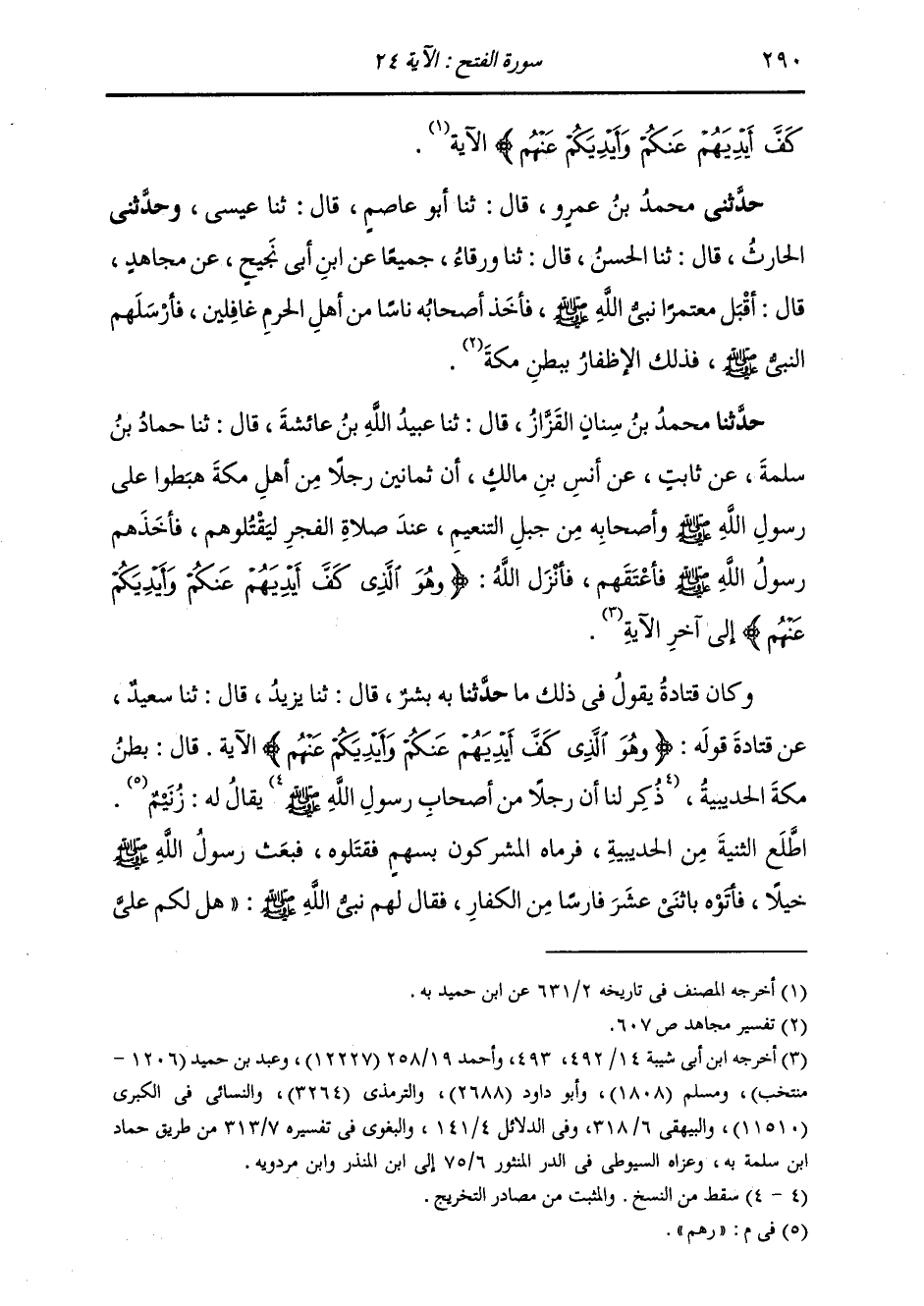 وَكَانَ قَتَادَةُ يَقُولُ فِي ذَلِكَ مَا: حَدَّثَنَا بِهِ بِشْرٌ، قَالَ: ثَنَا يَزِيدُ، قَالَ: ثَنَا سَعِيدٌ، عَنْ قَتَادَةَ، قَوْلَهُ: {وَهُوَ الَّذِي كَفَّ أَيْدِيَهُمْ عَنْكُمْ وَأَيْدِيَكُمْ عَنْهُمْ} [الفتح: 24] الْآيَةَ، قَالَ: بَطْنُ مَكَّةَ الْحُدَيْبِيَةُ يُقَالُ لَهُ رُهْمٌ: اطَّلَعَ الثَّنِيَّةَ مِنَ الْحُدَيْبِيَةِ، فَرَمَاهُ الْمُشْرِكُونَ بِسَهْمٍ فَقَتَلُوهُ، فَبَعَثَ رَسُولُ اللَّهِ صَلَّى اللهُ عَلَيْهِ وَسَلَّمَ خَيْلًا، فَأَتَوْهُ بِاثَنَيْ عَشَرَ فَارِسًا مِنَ الْكُفَّارِ، فَقَالَ لَهُمْ نَبِيُّ اللَّهِ صَلَّى اللهُ عَلَيْهِ وَسَلَّمَ: «§هَلْ لَكُمْ عَلَيَّ -[291]- عَهْدٌ؟ هَلْ لَكُمْ عَلَيَّ ذِمَّةٌ؟» قَالُوا: لَا، فَأَرْسَلَهُمْ، فَأَنْزَلَ اللَّهُ فِي ذَلِكَ الْقُرْآنَ {وَهُوَ الَّذِي كَفَّ أَيْدِيَهُمْ عَنْكُمْ وَأَيْدِيَكُمْ عَنْهُمْ} [الفتح: 24] إِلَى قَوْلِهِ: {بِمَا تَعْمَلُونَ بَصِيرًا} [الأحزاب: 9] "