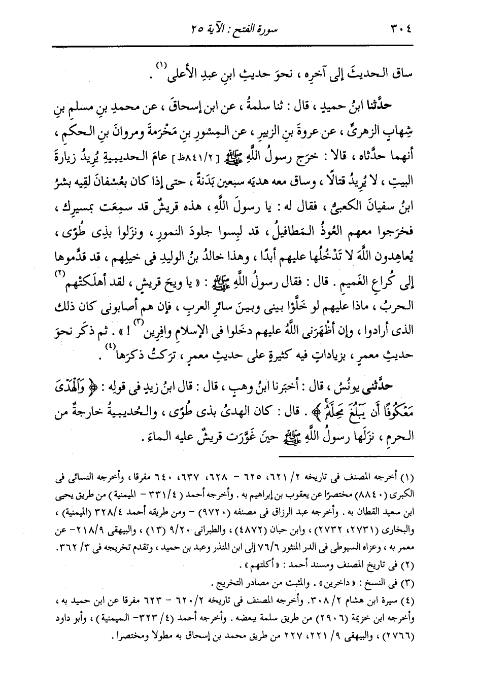 حَدَّثَنَا ابْنُ حُمَيْدٍ، قَالَ: ثَنَا سَلَمَةُ، عَنِ ابْنِ إِسْحَاقَ، عَنْ مُحَمَّدِ بْنِ مُسْلِمِ بْنِ شِهَابٍ الزُّهْرِيِّ، عَنْ عُرْوَةَ بْنِ الزُّبَيْرِ، عَنِ الْمِسْوَرِ بْنِ مَخْرَمَةَ، وَمَرْوَانَ بْنِ الْحَكَمِ أَنَّهُمَا حَدَّثَاهُ، قَالَا: §خَرَجَ رَسُولُ اللَّهِ صَلَّى اللهُ عَلَيْهِ وَسَلَّمَ عَامَ الْحُدَيْبِيَةِ، يُرِيدُ زِيَارَةَ الْبَيْتِ، لَا يُرِيدُ قِتَالًا، وَسَاقَ مَعَهُ هَدْيَهُ سَبْعِينَ بَدَنَةً، حَتَّى إِذَا كَانَ بِعُسْفَانَ لَقِيَهُ بِشْرُ بْنُ سُفْيَانَ الْكَعْبِيُّ، فَقَالَ لَهُ: يَا رَسُولَ اللَّهِ هَذِهِ قُرَيْشٌ قَدْ سَمِعَتْ بِمَسِيرِكَ، فَخَرَجُوا مَعَهُمُ الْعُوذُ الْمَطَافِيلُ قَدْ لَبِسُوا جُلُودَ النُّمُورِ، وَنَزَلُوا بِذِي طُوًى يُعَاهِدُونَ اللَّهَ، لَا تَدْخُلَهَا عَلَيْهِمْ أَبَدًا، وَهَذَا خَالِدُ بْنُ الْوَلِيدِ فِي خَيْلِهِمْ، قَدْ قَدَّمُوهَا إِلَى كُرَاعِ الْغَمِيمِ؛ قَالَ: فَقَالَ صَلَّى اللهُ عَلَيْهِ وَسَلَّمَ: «يَا وَيْحَ قُرَيْشٍ لَقَدْ أَهْلَكَتْهُمُ الْحَرْبُ، مَاذَا عَلَيْهِمْ لَوْ خَلَّوْا بَيْنِي وَبَيْنَ سَائِرِ الْعَرَبِ فَإِنْ هُمْ أَصَابُونِي كَانَ ذَلِكَ الَّذِي أَرَادُوا، وَإِنْ أَظْهَرَنِي اللَّهُ عَلَيْهِمْ دَخَلُوا فِي الْإِسْلَامِ دَاخِرِينَ» ثُمَّ ذَكَرَ نَحْوَ حَدِيثِ مَعْمَرٍ بِزِيَادَاتٍ فِيهِ كَثِيرَةٍ، عَلَى حَدِيثِ مَعْمَرٍ تَرَكْتُ ذِكْرَهَا