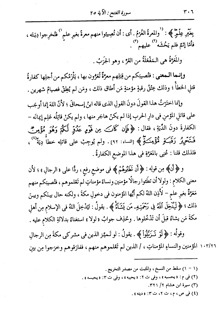 بِغَيْرِ عِلْمٍ} [الفتح: 25] «فَتَخَرَّجُوا دِيَتَهُ، فَأَمَّا إِثْمٌ فَلَمْ يَحْسُبْهُ عَلَيْهِمْ» وَالْمَعَرَّةُ: هِيَ الْمَفْعَلَةُ مِنَ الْعُرِّ، وَهُوَ الْجَرَبُ وَإِنَّمَا الْمَعْنَى: فَتُصِيبُكُمْ مِنْ قِبَلِهِمِ مَعَرَّةٌ تُعَرُّونَ بِهَا، يَلْزَمُكُمْ مِنْ أَجْلِهَا كَفَّارَةُ قَتْلِ الْخَطَأِ، وَذَلِكَ عِتْقُ رَقَبَةٍ مُؤْمِنَةٍ، مَنْ أَطَاقَ ذَلِكَ، وَمَنْ لَمْ يُطِقْ فَصِيَامُ شَهْرَيْنِ وَإِنَّمَا اخْتَرْتُ هَذَا الْقَوْلَ دُونَ الْقَوْلِ الَّذِي قَالَهُ ابْنُ إِسْحَاقَ، لِأَنَّ اللَّهَ إِنَّمَا أَوْجَبَ عَلَى قَاتِلِ الْمُؤْمِنِ فِي دَارِ الْحَرْبِ إِذَا لَمْ يَكُنْ هَاجَرَ مِنْهَا، وَلَمْ يَكُنْ قَاتَلَهُ عَلِمَ إِيمَانَهُ الْكَفَّارَةَ دُونَ الدِّيَةِ، فَقَالَ: {فَإِنْ كَانَ مِنْ قَوْمٍ عَدُوٍّ لَكُمْ وَهُوَ مُؤْمِنٌ فَتَحْرِيرُ رَقَبَةٍ مُؤْمِنَةٍ} [النساء: 92] لَمْ يُوجِبْ عَلَى قَاتِلِهِ خَطَأَ دِيَتِهِ، فَلِذَلِكَ قُلْنَا: عَنَى بِالْمَعَرَّةِ فِي هَذَا الْمَوْضِعِ الْكَفَّارَةَ، وَ {أَنْ} [الفتح: 25] مِنْ قَوْلِهِ: {أَنْ تَطَئُوهُمْ} فِي مَوْضِعِ رَفْعٍ رَدًّا عَلَى الرِّجَالِ، لِأَنَّ مَعْنَى الْكَلَامِ: وَلَوْلَا أَنْ تَطَئُوا رِجَالًا مُؤْمِنِينَ وَنِسَاءً مُؤْمِنَاتٍ لَمْ تَعْلَمُوهُمْ، فَتُصِيبُكُمْ مِنْهُمْ مَعَرَّةٌ بِغَيْرِ عِلْمٍ لَأَذِنَ اللَّهُ لَكُمْ أَيُّهَا الْمُؤْمِنُونَ فِي دُخُولِ مَكَّةَ، وَلَكِنَّهُ حَالَ بَيْنَكُمْ وَبَيْنَ ذَلِكَ {لِيُدْخِلَ اللَّهُ فِي رَحْمَتِهِ مَنْ يَشَاءُ} [الفتح: 25] يَقُولُ: لِيُدْخِلَ اللَّهُ فِي الْإِسْلَامِ مِنْ أَهْلِ مَكَّةَ مَنْ يَشَاءُ قَبْلَ أَنْ تَدْخُلُوهَا، وَحَذَفَ جَوَابَ لَوْلَا اسْتِغْنَاءً بِدِلَالَةِ الْكَلَامِ عَلَيْهِ