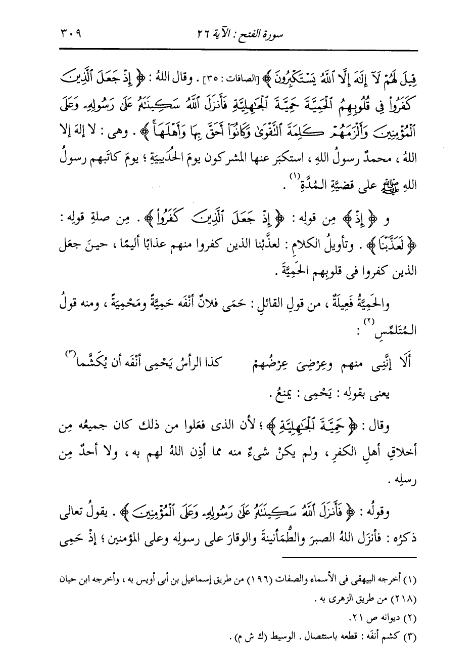 §وَقَوْلُهُ: {فَأَنْزَلَ اللَّهُ سَكِينَتَهُ عَلَى رَسُولِهِ وَعَلَى الْمُؤْمِنِينَ} [الفتح: 26] يَقُولُ تَعَالَى ذِكْرُهُ فَأَنْزَلَ اللَّهُ الصَّبْرَ وَالطُّمَأْنِينَةَ وَالْوَقَارَ عَلَى رَسُولِهِ وَعَلَى الْمُؤْمِنِينَ، إِذْ حَمِيَ -[310]- الَّذِينَ كَفَرُوا حَمِيَّةَ الْجَاهِلِيَّةِ، وَمَنَعُوهُمْ مِنَ الطَّوَافِ بِالْبَيْتِ، وَأَبَوْا أَنْ يَكْتُبُوا فِي الْكِتَابِ بَيْنَهُ وَبَيْنَهُمْ بِسْمِ اللَّهِ الرَّحْمَنِ الرَّحِيمِ، وَمُحَمَّدٌ رَسُولُ اللَّهِ {وَأَلْزَمَهُمْ كَلِمَةَ التَّقْوَى} [الفتح: 26] يُقَالُ: أَلْزَمُهُمْ قَوْلَ لَا إِلَهَ إِلَّا اللَّهُ الَّتِي يَتَّقُونَ بِهَا النَّارَ، وَأَلِيمِ الْعَذَابِ وَبِنَحْوِ الَّذِي قُلْنَا فِي ذَلِكَ قَالَ أَهْلُ التَّأْوِيلِ عَلَى اخْتِلَافٍ فِي ذَلِكَ مِنْهُمْ، وَرُوِيَ بِهِ الْخَبَرُ عَنْ رَسُولِ اللَّهِ صَلَّى اللهُ عَلَيْهِ وَسَلَّمَ