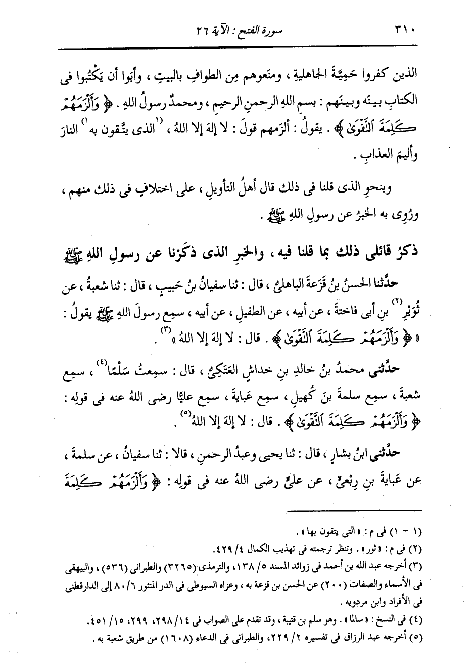حَدَّثَنِي ابْنُ بَشَّارٍ، قَالَ: ثَنَا يَحْيَى وَعَبْدُ الرَّحْمَنِ، قَالَا: ثَنَا سُفْيَانُ، عَنْ سَلَمَةَ، عَنْ عَبَايَةَ بْنِ رِبْعِيٍّ، عَنْ عَلِيٍّ رَضِيَ اللَّهُ عَنْهُ، فِي قَوْلِهِ: {§وَأَلْزَمَهُمْ كَلِمَةَ -[311]- التَّقْوَى} [الفتح: 26] قَالَ: «لَا إِلَهَ إِلَّا اللَّهُ، وَاللَّهُ أَكْبَرُ»