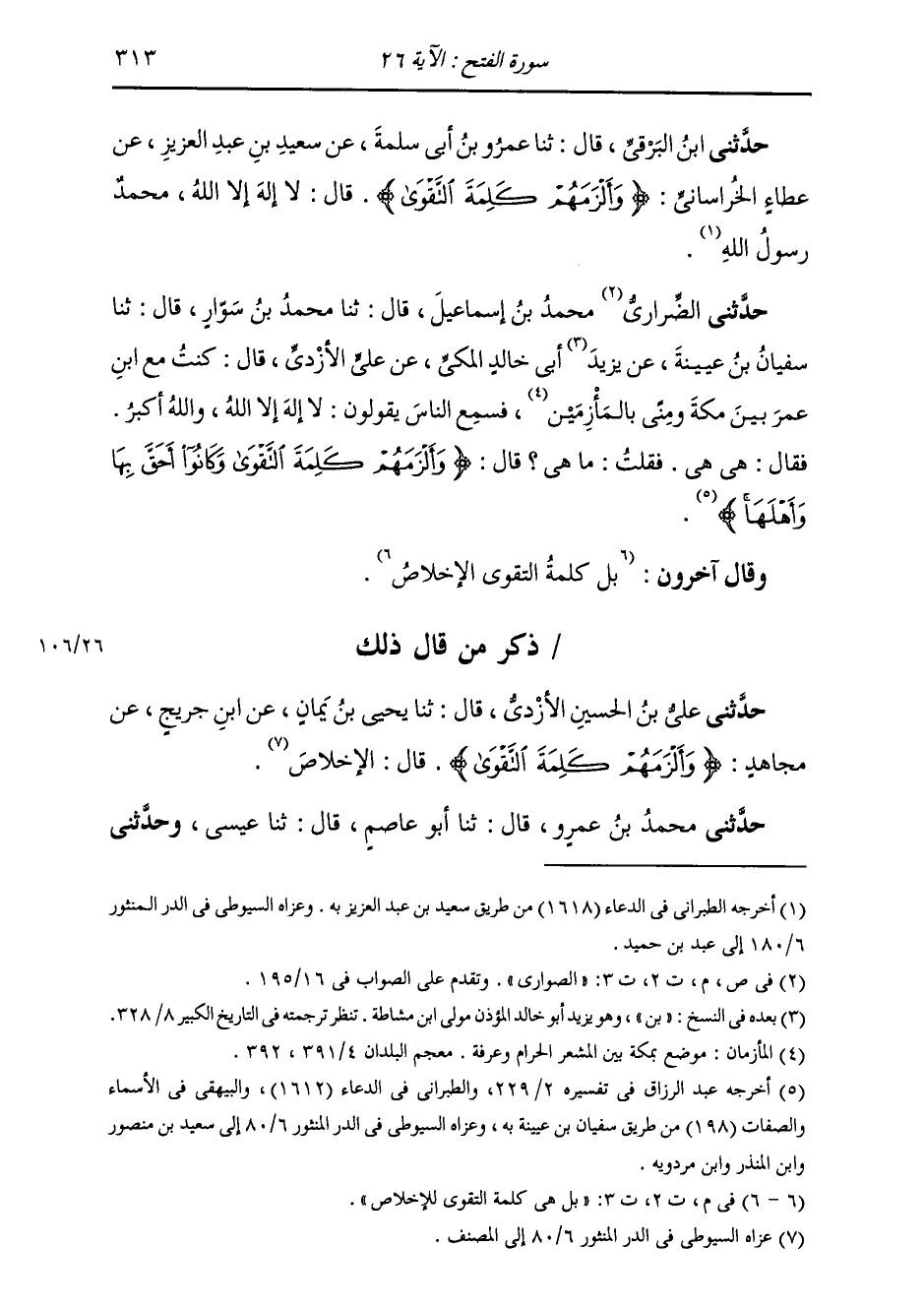 حَدَّثَنِي مُحَمَّدُ بْنُ عَمْرٍو، قَالَ: ثَنَا أَبُو عَاصِمٍ، قَالَ: ثَنَا عِيسَى، وَحَدَّثَنِي -[314]- الْحَارِثُ، قَالَ: ثَنَا الْحَسَنُ، قَالَ: ثَنَا وَرْقَاءُ جَمِيعًا، عَنِ ابْنِ أَبِي نَجِيحٍ، عَنْ مُجَاهِدٍ {§كَلِمَةَ التَّقْوَى} [الفتح: 26] «كَلِمَةَ الْإِخْلَاصِ» وَقَالَ آخَرُونَ: هِيَ قَوْلُهُ: بِسْمِ اللَّهِ الرَّحْمَنِ الرَّحِيمِ