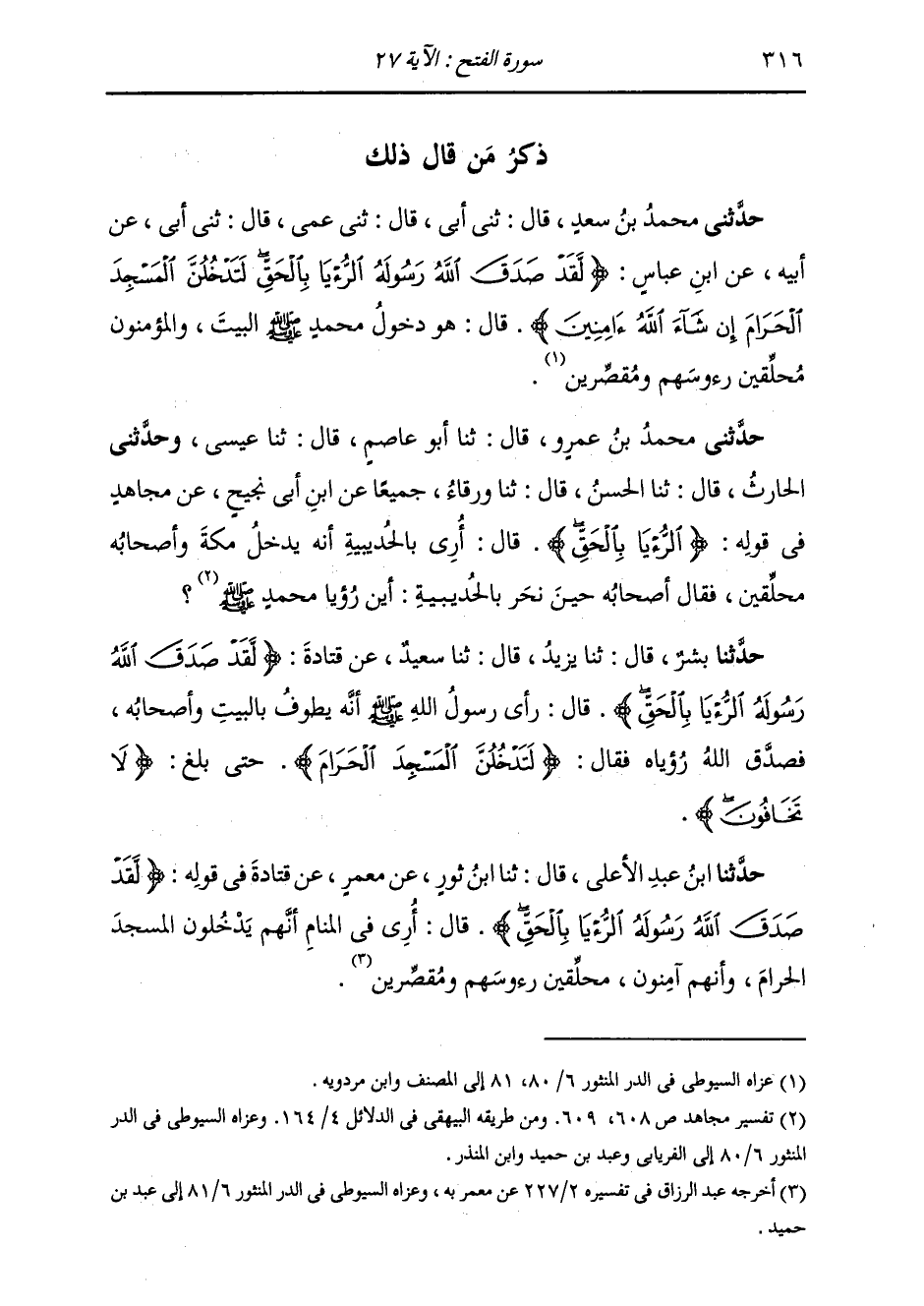 ذِكْرُ مَنْ قَالَ ذَلِكَ: حَدَّثَنِي مُحَمَّدُ بْنُ سَعْدٍ، قَالَ: ثَنِي أَبِي , قَالَ: ثَنِي عَمِّي , قَالَ: ثَنِي أَبِي , عَنْ أَبِيهِ، عَنِ ابْنِ عَبَّاسٍ، {§لَقَدْ صَدَقَ اللَّهُ رَسُولَهُ الرُّؤْيَا بِالْحَقِّ لَتَدْخُلُنَّ الْمَسْجِدَ الْحَرَامَ إِنْ شَاءَ اللَّهُ آمِنَيْنِ} [الفتح: 27] قَالَ: «هُوَ دُخُولُ مُحَمَّدٍ صَلَّى اللهُ عَلَيْهِ وَسَلَّمَ الْبَيْتَ وَالْمُؤْمِنُونِ، مُحَلِّقِينَ رُءُوسَهُمْ وَمُقَصِّرِينَ»