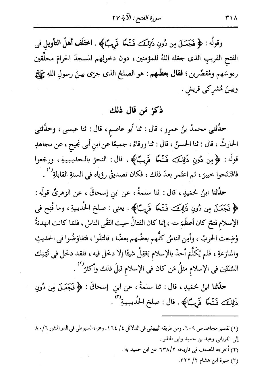 حَدَّثَنَا ابْنُ حُمَيْدٍ، قَالَ: ثَنَا سَلَمَةُ، عَنِ ابْنِ إِسْحَاقَ، {§فَجَعَلَ مِنْ دُونِ ذَلِكَ فَتْحًا قَرِيبًا} [الفتح: 27] قَالَ: «صُلْحَ الْحُدَيْبِيَةِ» -[319]- وَقَالَ آخَرُونَ: عَنَى بِالْفَتْحِ الْقَرِيبِ فِي هَذَا الْمَوْضِعِ: فَتْحَ خَيْبَرَ