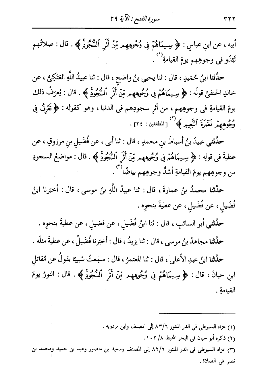 حَدَّثَنِي عُبَيْدُ بْنُ أَسْبَاطِ بْنِ مُحَمَّدٍ قَالَ: ثَنَا أَبِي، عَنْ فُضَيْلِ بْنِ مَرْزُوقٍ، عَنْ عَطِيَّةَ، فِي قَوْلِهِ: {§سِيمَاهُمْ فِي وُجُوهِهِمْ مِنْ أَثَرِ السُّجُودِ} [الفتح: 29] قَالَ: «مَوَاضِعُ السُّجُودِ مِنْ وُجُوهِهِمْ يَوْمَ الْقِيَامَةِ أَشَدُّ وُجُوهِهِمْ بَيَاضًا» حَدَّثَنَا مُحَمَّدُ بْنُ عُمَارَةَ قَالَ: ثَنَا عُبَيْدُ اللَّهِ بْنُ مُوسَى قَالَ: أَخْبَرَنَا ابْنُ فُضَيْلٍ، عَنْ فُضَيْلٍ، عَنْ عَطِيَّةَ، بِنَحْوِهِ حَدَّثَنِي أَبُو السَّائِبِ قَالَ: ثَنَا ابْنُ فُضَيْلٍ، عَنْ فُضَيْلٍ، عَنْ عَطِيَّةَ، بِنَحْوِهِ حَدَّثَنَا مُجَاهِدُ بْنُ مُوسَى قَالَ: ثَنَا يَزِيدُ قَالَ: أَخْبَرَنَا فُضَيْلٌ، عَنْ عَطِيَّةَ، مِثْلَهُ