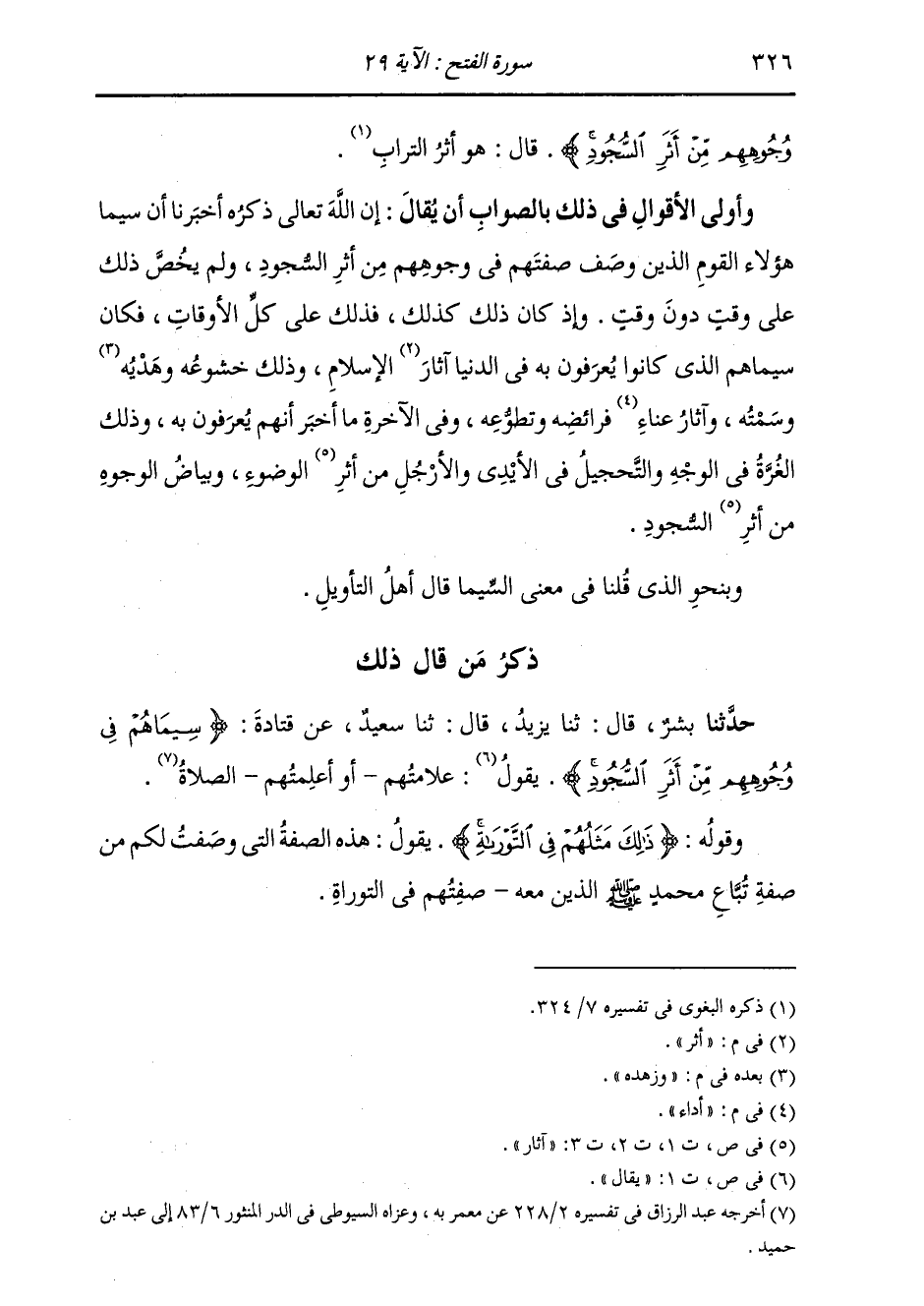 ذِكْرُ مَنْ قَالَ ذَلِكَ: حَدَّثَنَا بِشْرٌ قَالَ: ثَنَا يَزِيدُ قَالَ: ثَنَا سَعِيدٌ، عَنْ قَتَادَةَ، {§سِيمَاهُمْ فِي وُجُوهِهِمْ مِنْ أَثَرِ السُّجُودِ} [الفتح: 29] يَقُولُ: «عَلَامَتُهُمْ أَوْ أَعْلَمَتْهُمُ الصَّلَاةُ»