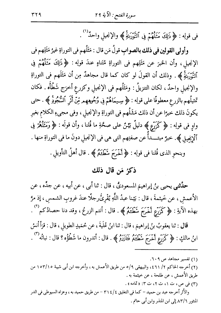 ذِكْرُ مَنْ قَالَ ذَلِكَ: حَدَّثَنِي يَحْيَى بْنُ إِبْرَاهِيمَ الْمَسْعُودِيُّ قَالَ: ثَنَا أَبِي، عَنْ أَبِيهِ، عَنْ جَدِّهِ، عَنِ الْأَعْمَشِ، عَنْ خَيْثَمَةَ قَالَ: بَيْنَا عَبْدُ اللَّهِ يُقْرِئُ رَجُلًا عِنْدَ غُرُوبِ الشَّمْسِ، إِذْ مَرَّ بِهَذِهِ الْآيَةِ {كَزَرْعٍ أَخْرَجَ شَطْأَهُ} [الفتح: 29] قَالَ: «§أَنْتُمُ الزَّرْعُ، وَقَدْ دَنَا حَصَادُكُمْ»