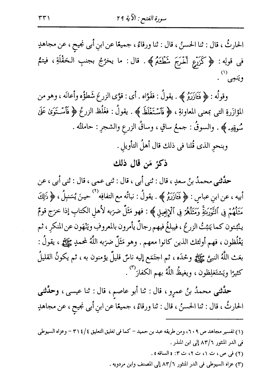 حَدَّثَنِي مُحَمَّدُ بْنُ عَمْرٍو قَالَ: ثَنَا أَبُو عَاصِمٍ قَالَ: ثَنَا عِيسَى، وَحَدَّثَنِي الْحَارِثُ قَالَ: ثَنَا الْحَسَنُ قَالَ: ثَنَا وَرْقَاءُ، جَمِيعًا، عَنِ ابْنِ أَبِي نَجِيحٍ، عَنْ مُجَاهِدٍ، -[332]- فِي قَوْلِهِ {§فَآزَرَهُ} [الفتح: 29] قَالَ: «فَشَدَّهُ وَأَعَانَهُ»