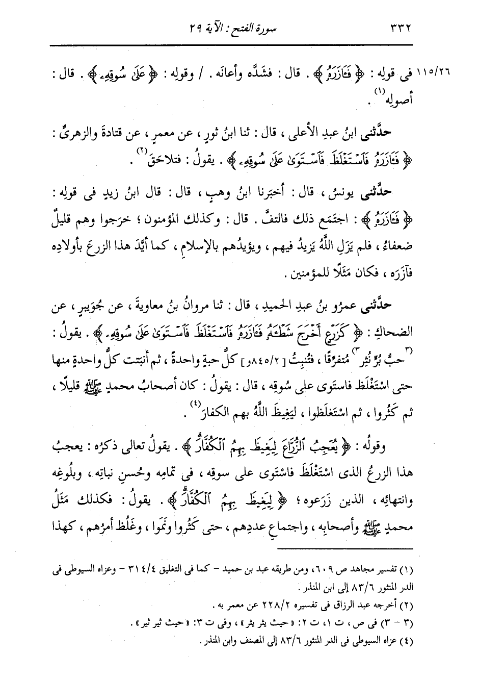 حَدَّثَنِي ابْنُ عَبْدِ الْأَعْلَى قَالَ: ثَنَا ابْنُ ثَوْرٍ، عَنْ مَعْمَرٍ، عَنْ قَتَادَةَ، وَالزُّهْرِيِّ، {§فَآزَرَهُ فَاسْتَغْلَظَ فَاسْتَوَى عَلَى سُوقِهِ} [الفتح: 29] يَقُولُ: «فَتَلَاحَقَ»
