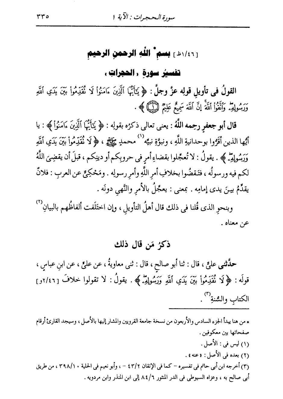ذِكْرُ مَنْ قَالَ ذَلِكَ: حَدَّثَنَا عَلِيٌّ قَالَ: ثَنَا أَبُو صَالِحٍ قَالَ: ثَنِي مُعَاوِيَةُ، عَنْ عَلِيٍّ، عَنِ ابْنِ عَبَّاسٍ، قَوْلَهُ: {§لَا تُقَدِّمُوا بَيْنَ يَدَيِ اللَّهِ وَرَسُولِهِ} [الحجرات: 1] يَقُولُ: «لَا تَقُولُوا خِلَافَ الْكِتَابِ وَالسُّنَّةِ»