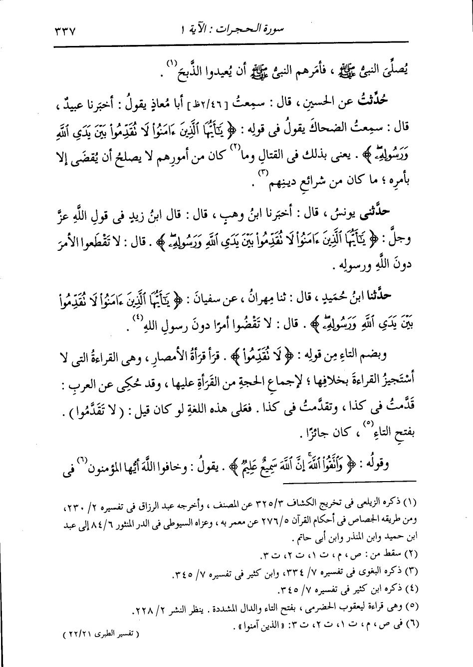 وَحَدَّثَنَا ابْنُ حُمَيْدٍ قَالَ: ثَنَا مِهْرَانُ، عَنْ سُفْيَانَ، {§يَا أَيُّهَا الَّذِينَ آمَنُوا لَا تُقَدِّمُوا بَيْنَ يَدَيِ اللَّهِ وَرَسُولِهِ} [الحجرات: 1] قَالَ: «لَا تَقْضُوا أَمْرًا دُونَ رَسُولِ اللَّهِ» وَبِضَمِّ التَّاءِ مِنْ قَوْلِهِ: {لَا تُقَدِّمُوا} [الحجرات: 1] قَرَأَ قُرَّاءُ الْأَمْصَارِ، وَهِيَ الْقِرَاءَةُ الَّتِي لَا أَسْتَجِيزُ الْقِرَاءَةَ بِخِلَافِهَا، لِإِجْمَاعِ الْحُجَّةِ مِنَ الْقُرَّاءِ عَلَيْهَا، وَقَدْ حُكِيَ عَنِ الْعَرَبِ قَدَّمْتُ فِي كَذَا، وَتَقَدَّمْتُ فِي كَذَا، فَعَلَى هَذِهِ اللُّغَةِ لَوْ كَانَ قِيلَ: (لَا تَقَدَّمُوا) بِفَتْحِ التَّاءِ كَانَ جَائِزًا