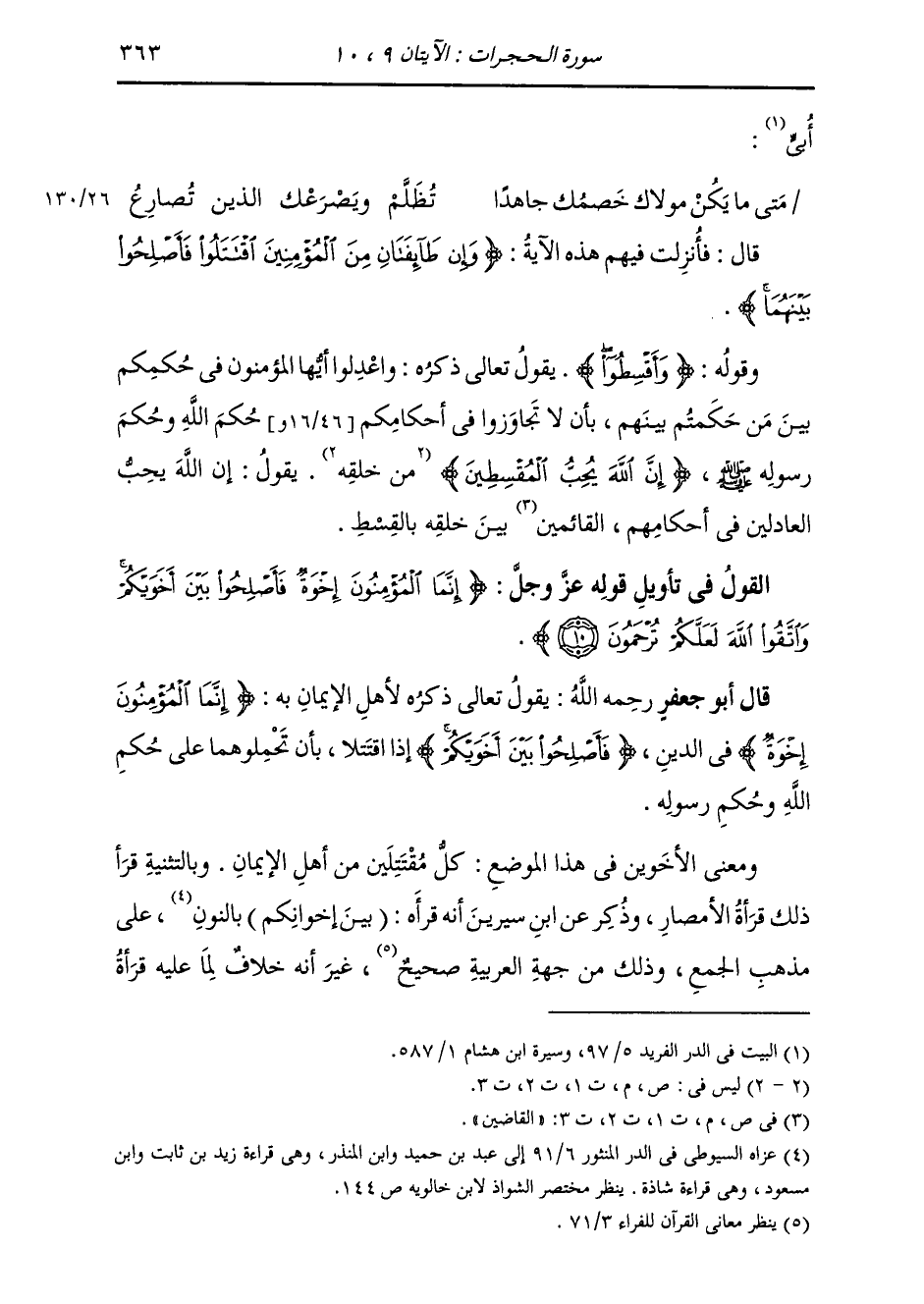 §الْقَوْلُ فِي تَأْوِيلِ قَوْلِهِ تَعَالَى: {إِنَّمَا الْمُؤْمِنُونَ إِخْوَةٌ فَأَصْلِحُوا بَيْنَ أَخَوَيْكُمْ وَاتَّقُوا اللَّهَ لَعَلَّكُمْ تُرْحَمُونَ} [الحجرات: 10] يَقُولُ تَعَالَى ذِكْرُهُ لِأَهْلِ الْإِيمَانِ بِهِ {إِنَّمَا الْمُؤْمِنُونَ إِخْوَةٌ} [الحجرات: 10] فِي الدِّينِ {فَأَصْلِحُوا بَيْنَ أَخَوَيْكُمْ} [الحجرات: 10] إِذَا اقْتَتَلَا بِأَنْ تَحْمِلُوهُمَا عَلَى حُكْمِ اللَّهِ وَحُكْمِ رَسُولِهِ وَمَعْنَى الْأَخَوَيْنِ فِي هَذَا الْمَوْضِعِ: كُلٌّ مُقْتَتِلَيْنِ مِنْ أَهْلِ الْإِيمَانِ، وَبِالتَّثْنِيَةِ قَرَأَ ذَلِكَ قُرَّاءُ الْأَمْصَارِ وَذُكِرَ عَنِ ابْنِ سِيرِينَ أَنَّهُ قَرَأَ «بَيْنَ إِخْوَانِكُمْ» بِالنُّونِ عَلَى مَذْهَبِ الْجَمْعِ، وَذَلِكَ مِنْ جِهَةِ الْعَرَبِيَّةِ صَحِيحٌ، غَيْرَ أَنَّهُ خِلَافٌ لِمَا عَلَيْهِ قُرَّاءُ