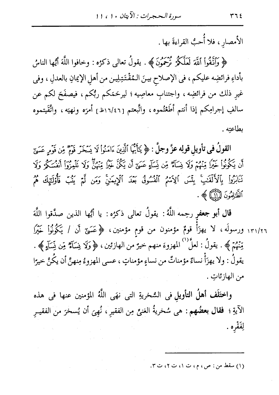 الْأَمْصَارِ، فَلَا أُحِبُّ الْقِرَاءَةَ بِهَا {وَاتَّقُوا اللَّهَ لَعَلَّكُمْ تُرْحَمُونَ} [الحجرات: 10] يَقُولُ تَعَالَى ذِكْرُهُ: وَخَافُوا اللَّهَ أَيُّهَا النَّاسُ بِأَدَاءِ فَرَائِضِهِ عَلَيْكُمْ فِي الْإِصْلَاحِ بَيْنَ الْمُقْتَتِلِينَ مِنْ أَهْلِ الْإِيمَانِ بِالْعَدْلِ، وَفِي غَيْرِ ذَلِكَ مِنْ فَرَائِضِهِ، وَاجْتِنَابِ مَعَاصِيهِ، لِيَرْحَمَكُمْ رَبُّكُمْ، فَيَصْفَحَ لَكُمْ عَنْ سَالِفِ إِجْرَامِكُمْ إِذَا أَنْتُمْ أَطَعْتُمُوهُ، وَاتَّبَعْتُمْ أَمْرَهُ وَنَهْيَهُ، وَاتَّقَيْتُمُوهُ بِطَاعَتِهِ