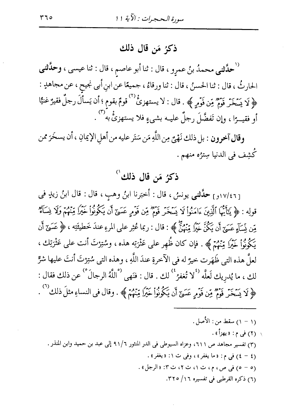 ذِكْرُ مَنْ قَالَ ذَلِكَ: حَدَّثَنِي مُحَمَّدُ بْنُ عَمْرٍو قَالَ: ثَنَا أَبُو عَاصِمٍ قَالَ: ثَنَا عِيسَى، وَحَدَّثَنِي الْحَارِثُ قَالَ: ثَنَا الْحَسَنُ قَالَ: ثَنَا وَرْقَاءُ، جَمِيعًا، عَنِ ابْنِ أَبِي نَجِيحٍ، عَنْ مُجَاهِدٍ، {§لَا يَسْخَرْ قَوْمٌ مِنْ قَوْمٍ} [الحجرات: 11] قَالَ: «لَا يَهْزَأْ قَوْمٌ بِقَوْمٍ أَنْ يَسْأَلَ رَجُلٌ فَقِيرٌ غَنِيًّا، أَوْ فَقِيرًا، وَإِنْ تَفَضَّلَ رَجُلٌ عَلَيْهِ بِشَيْءٍ فَلَا يَسْتَهْزِئْ بِهِ» وَقَالَ آخَرُونَ: بَلْ ذَلِكَ نُهِيَ مِنَ اللَّهِ مِنْ سَتَرَ عَلَيْهِ مِنْ أَهْلِ الْإِيمَانَ أَنْ يَسْخَرَ مِمَّنْ كَشَفَ فِي الدُّنْيَا سَتَرَهُ مِنْهُمْ