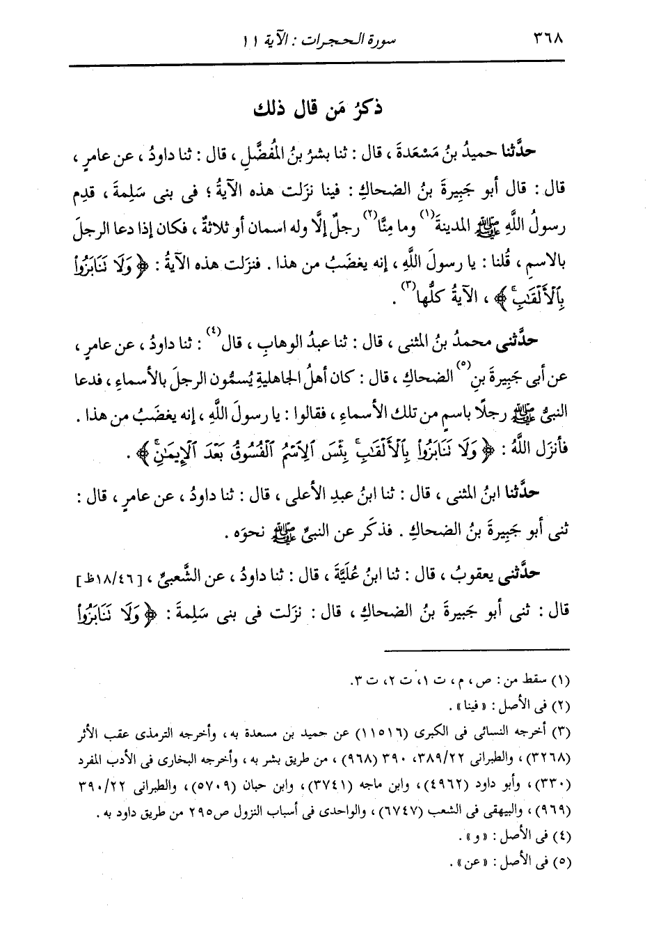 حَدَّثَنِي مُحَمَّدُ بْنُ الْمُثَنَّى قَالَ: ثَنَا عَبْدُ الْوَهَّابِ قَالَ: ثَنَا دَاوُدُ، عَنْ عَامِرٍ، عَنْ أَبِي جَبِيرَةَ بْنِ الضَّحَّاكِ قَالَ: " §كَانَ أَهْلُ الْجَاهِلِيَّةِ يُسَمُّونَ الرَّجُلَ بِالْأَسْمَاءِ، فَدَعَا النَّبِيُّ صَلَّى اللهُ عَلَيْهِ وَسَلَّمَ رَجُلًا بِاسْمٍ مِنْ تِلْكَ الْأَسْمَاءِ، فَقَالُوا: يَا رَسُولَ اللَّهِ إِنَّهُ يَغْضَبُ مِنْ هَذَا، فَأَنْزَلَ اللَّهُ {وَلَا تَنَابَزُوا بِالْأَلْقَابِ بِئْسَ الِاسْمُ الْفُسُوقُ بَعْدَ الْإِيمَانِ} [الحجرات: 11] " حَدَّثَنَا ابْنُ الْمُثَنَّى قَالَ: ثَنَا ابْنُ عَبْدِ الْأَعْلَى قَالَ: ثَنَا دَاوُدُ، عَنْ عَامِرٍ قَالَ: ثَنِي أَبُو جُبَيْرَةَ بْنُ الضَّحَّاكِ، فَذَكَرَ عَنِ النَّبِيِّ صَلَّى اللهُ عَلَيْهِ وَسَلَّمَ، نَحْوَهُ