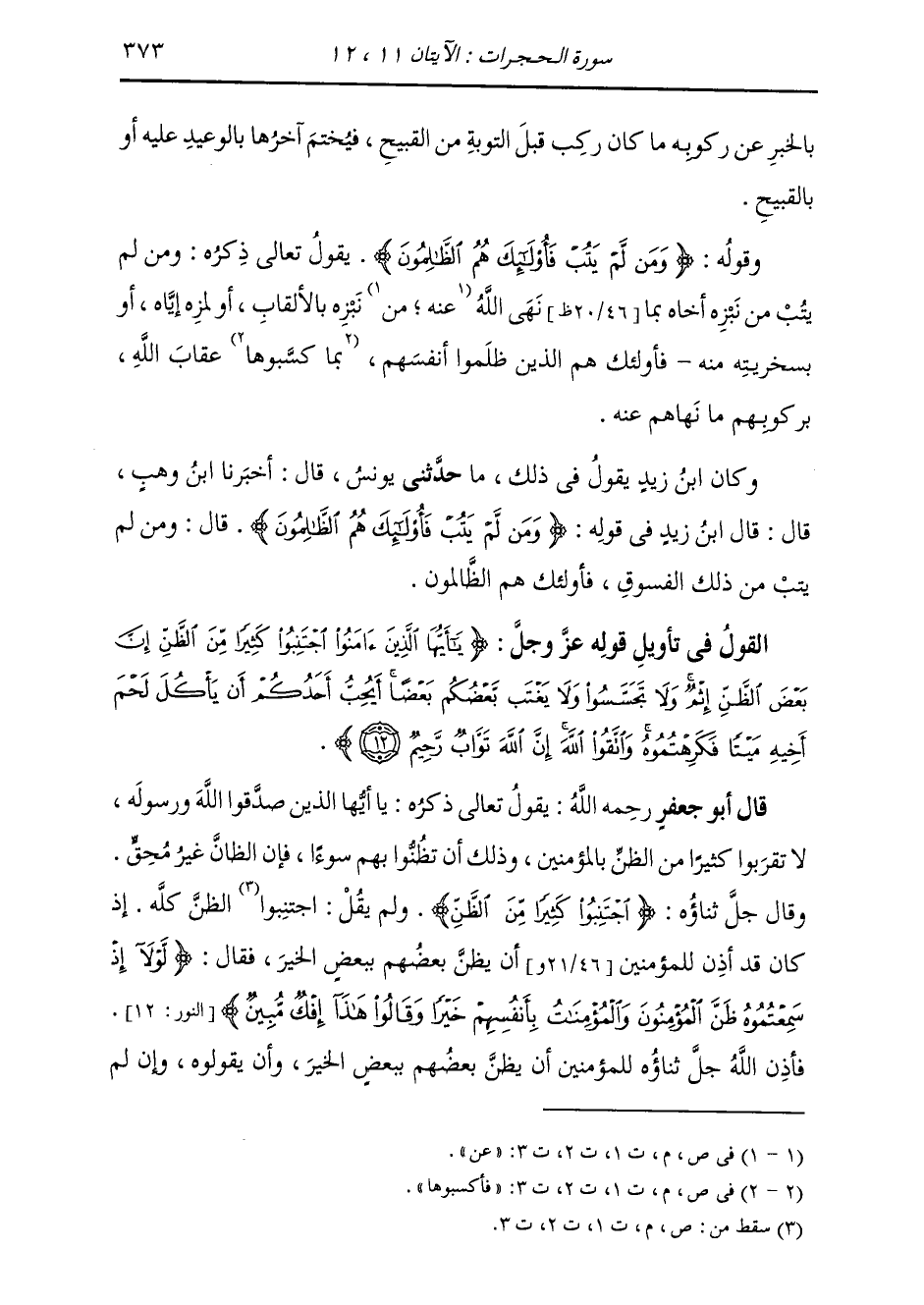 §الْقَوْلُ فِي تَأْوِيلِ قَوْلِهِ تَعَالَى: {يَا أَيُّهَا الَّذِينَ آمَنُوا اجْتَنِبُوا كَثِيرًا مِنَ الظَّنِّ إِنَّ بَعْضَ الظَّنِّ إِثْمٌ وَلَا تَجَسَّسُوا وَلَا يَغْتَبْ بَّعْضُكُمْ بَعْضًا أَيُحِبُّ أَحَدُكُمْ أَنْ يَأْكُلَ لَحْمَ أَخِيهِ مَيْتًا فَكَرِهْتُمُوهُ وَاتَّقُوا اللَّهَ إِنَّ اللَّهَ تَوَّابٌ رَّحِيمٌ} [الحجرات: 12] يَقُولُ تَعَالَى ذِكْرُهُ: يَا أَيُّهَا الَّذِينَ صَدَّقُوا اللَّهَ وَرَسُولَهُ، لَا تَقْرَبُوا كَثِيرًا مِنَ الظَّنِّ بِالْمُؤْمِنِينَ، وَذَلِكَ أَنْ تَظُنُّوا بِهِمْ سُوءًا، فَإِنَّ الظَّانَّ غَيْرُ مُحِقٍّ، وَقَالَ جَلَّ ثَنَاؤُهُ: {اجْتَنِبُوا كَثِيرًا مِنَ الظَّنِّ} [الحجرات: 12] وَلَمْ يَقُلِ: الظَّنَّ كُلَّهُ، إِذْ كَانَ قَدْ أَذِنَ لِلْمُؤْمِنِينَ أَنْ يَظُنَّ بَعْضُهُمْ بِبَعْضٍ الْخَيْرَ، فَقَالَ: {لَوْلَا إِذْ سَمِعْتُمُوهُ ظَنَّ الْمُؤْمِنُونَ وَالْمُؤْمِنَاتُ بِأَنْفُسِهِمْ خَيْرًا وَقَالُوا هَذَا إِفْكٌ مُبِينٌ} [النور: 12] فَأَذِنَ اللَّهُ جَلَّ ثَنَاؤُهُ لِلْمُؤْمِنِينَ أَنْ يَظُنَّ بَعْضُهُمْ بِبَعْضٍ الْخَيْرَ وَأَنْ يَقُولُوهُ، وَإِنْ لَمْ