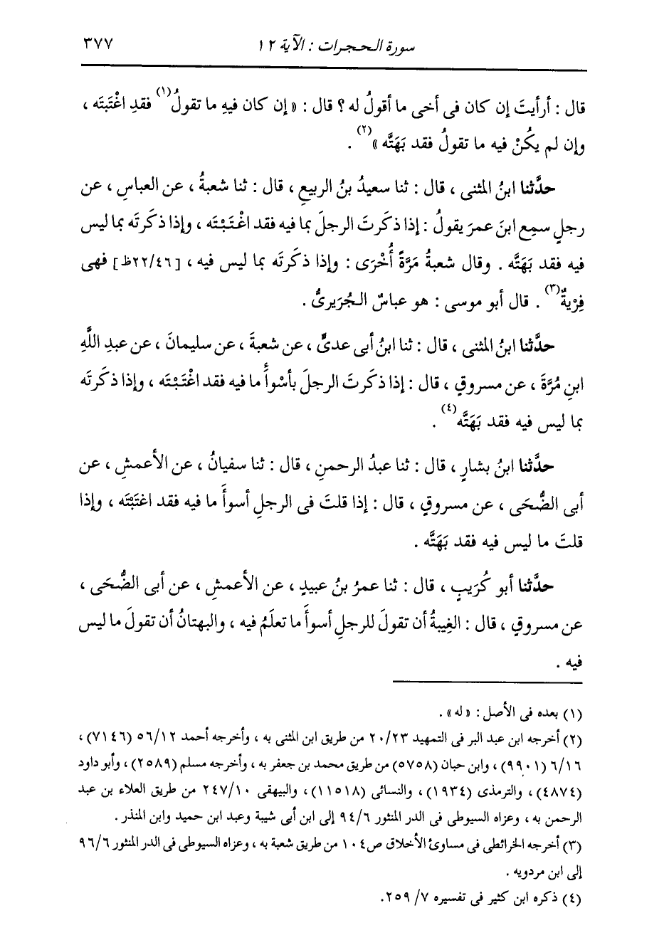 حَدَّثَنَا ابْنُ الْمُثَنَّى قَالَ: ثَنَا ابْنُ أَبِي عَدِيٍّ، عَنْ شُعْبَةَ، عَنْ سُلَيْمَانَ، عَنْ عَبْدِ اللَّهِ بْنِ مُرَّةَ، عَنْ مَسْرُوقٍ قَالَ: «§إِذَا ذَكَرْتَ الرَّجُلَ بِأَسْوَأَ مَا فِيهِ فَقَدِ اغْتَبْتَهُ، وَإِذَا ذَكَرْتَهُ بِمَا لَيْسَ فِيهِ فَقَدْ بَهَتَّهُ»