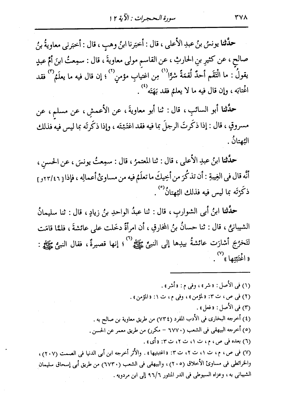 حَدَّثَنَا ابْنُ أَبِي الشَّوَارِبِ قَالَ: ثَنَا عَبْدُ الْوَاحِدِ بْنُ زِيَادٍ قَالَ: ثَنَا سُلَيْمَانُ الشَّيْبَانِيُّ قَالَ: ثَنَا حَسَّانُ بْنُ الْمُخَارِقِ، أَنَّ امْرَأَةً، دَخَلَتْ عَلَى عَائِشَةَ؛ فَلَمَّا قَامَتْ لِتَخْرُجَ أَشَارَتْ عَائِشَةُ بِيَدِهَا إِلَى النَّبِيِّ صَلَّى اللهُ عَلَيْهِ وَسَلَّمَ، أَيْ أَنَّهَا قَصِيرَةٌ، فَقَالَ النَّبِيُّ صَلَّى اللهُ عَلَيْهِ وَسَلَّمَ: «§اغْتَبْتِيهَا»