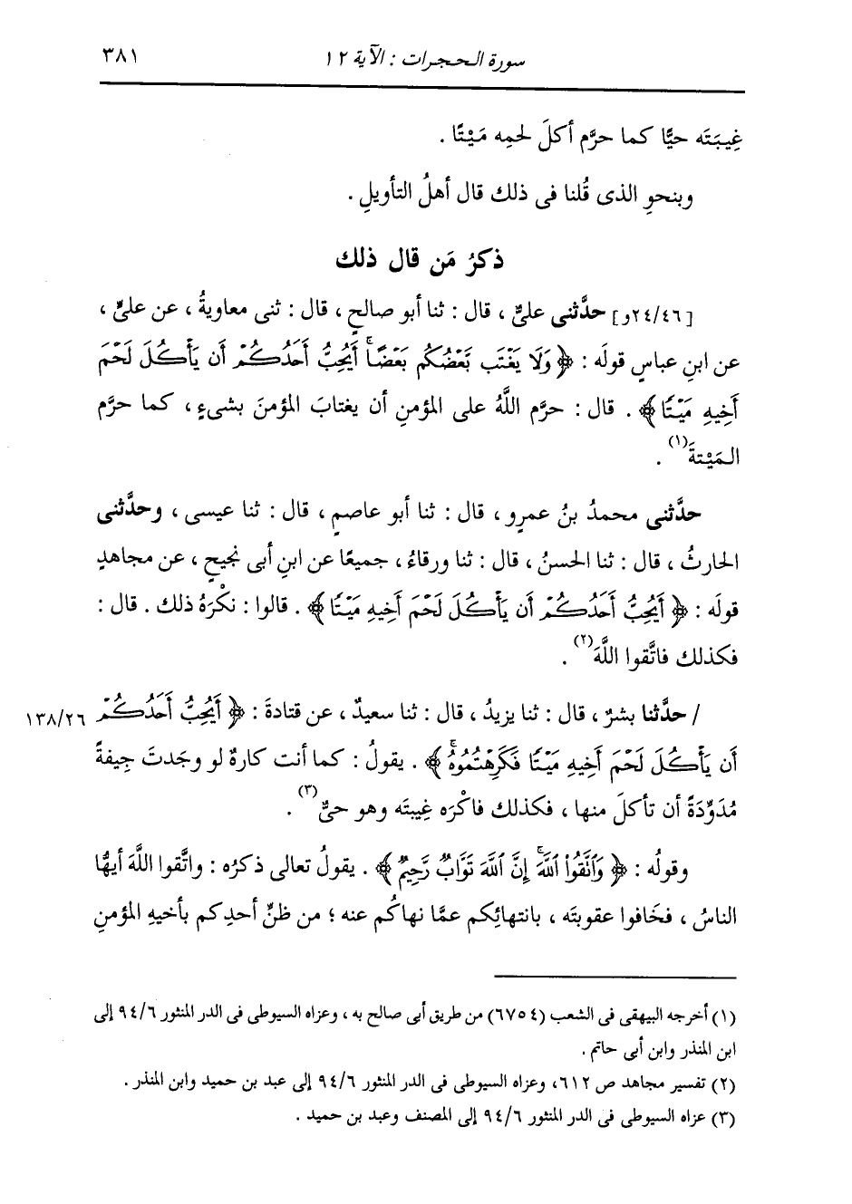 ذِكْرُ مَنْ قَالَ ذَلِكَ: حَدَّثَنِي عَلِيٌّ قَالَ: ثَنَا أَبُو صَالِحٍ قَالَ: ثَنِي مُعَاوِيَةُ، عَنْ عَلِيٍّ، عَنِ ابْنِ عَبَّاسٍ، قَوْلَهُ: {§وَلَا يَغْتَبْ بَعْضُكُمْ بَعْضًا أَيُحِبُّ أَحَدُكُمْ أَنْ يَأْكُلَ لَحْمَ أَخِيهِ مَيْتًا} [الحجرات: 12] قَالَ: «حَرَّمَ اللَّهُ عَلَى الْمُؤْمِنِ أَنْ يَغْتَابَ الْمُؤْمِنَ بِشَيْءٍ، كَمَا حَرَّمَ الْمَيْتَةَ»
