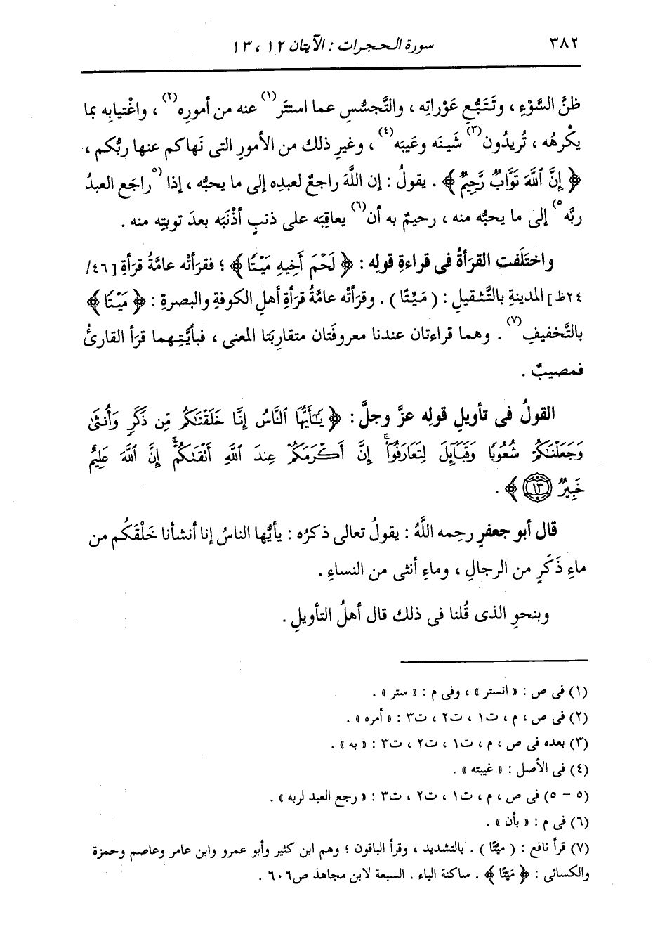 ظَنَّ السُّوءِ، وَتَتَبُّعِ عَوْرَاتِهِ، وَالتَّجَسُّسِ عَمَّا سَتَرَ عَنْهُ مِنْ أَمْرِهِ، وَاغْتِيَابِهِ بِمَا يَكْرَهُهُ، تُرِيدُونَ بِهِ شَيْنَهُ وَعَيْبَهُ، وَغَيْرِ ذَلِكَ مِنَ الْأُمُورِ الَّتِي نَهَاكُمْ عَنْهَا رَبُّكُمْ {إِنَّ اللَّهَ تَوَّابٌ رَحِيمٌ} [الحجرات: 12] يَقُولُ: إِنَّ اللَّهَ رَاجِعٌ لِعَبْدِهِ إِلَى مَا يُحِبُّهُ إِذَا رَجَعَ الْعَبْدُ لِرَبِّهِ إِلَى مَا يُحِبُّهُ مِنْهُ، رَحِيمٌ بِهِ بِأَنْ يُعَاقِبَهُ عَلَى ذَنْبٍ أَذْنَبَهُ بَعْدَ تَوْبَتِهِ مِنْهُ. وَاخْتَلَفَتِ الْقُرَّاءُ فِي قِرَاءَةِ قَوْلِهِ: {لَحْمَ أَخِيهِ مَيْتًا} [الحجرات: 12] فَقَرَأَتْهُ عَامَّةُ قُرَّاءِ الْمَدِينَةِ بِالتَّثْقِيلِ (مَيِّتًا) ، وَقَرَأَتْهُ عَامَّةُ قُرَّاءِ الْكُوفَةِ وَالْبَصْرَةِ {مَيْتًا} [الأنعام: 122] بِالتَّخْفِيفِ، وَهُمَا قِرَاءَتَانِ عِنْدَنَا مَعْرُوفَتَانِ مُتَقَارِبَتَا الْمَعْنَى، فَبِأَيَّتِهِمَا قَرَأَ الْقَارِئُ فَمُصِيبٌ