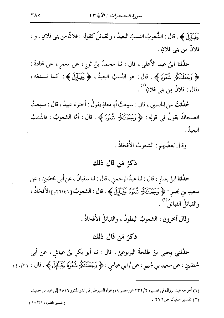 ذِكْرُ مَنْ قَالَ ذَلِكَ: حَدَّثَنَا ابْنُ بَشَّارٍ قَالَ: ثَنَا عَبْدُ الرَّحْمَنِ قَالَ: ثَنَا سُفْيَانُ، عَنْ أَبِي حَصِينٍ، عَنْ سَعِيدِ بْنِ جُبَيْرٍ، {§وَجَعَلْنَاكُمْ شُعُوبًا وَقَبَائِلَ} [الحجرات: 13] قَالَ: " الشُّعُوبُ: الْأَفْخَاذُ، وَالْقَبَائِلُ: الْقَبَائِلُ " وَقَالَ آخَرُونَ: الشُّعُوبُ: الْبُطُونُ، وَالْقَبَائِلُ: الْأَفْخَاذُ