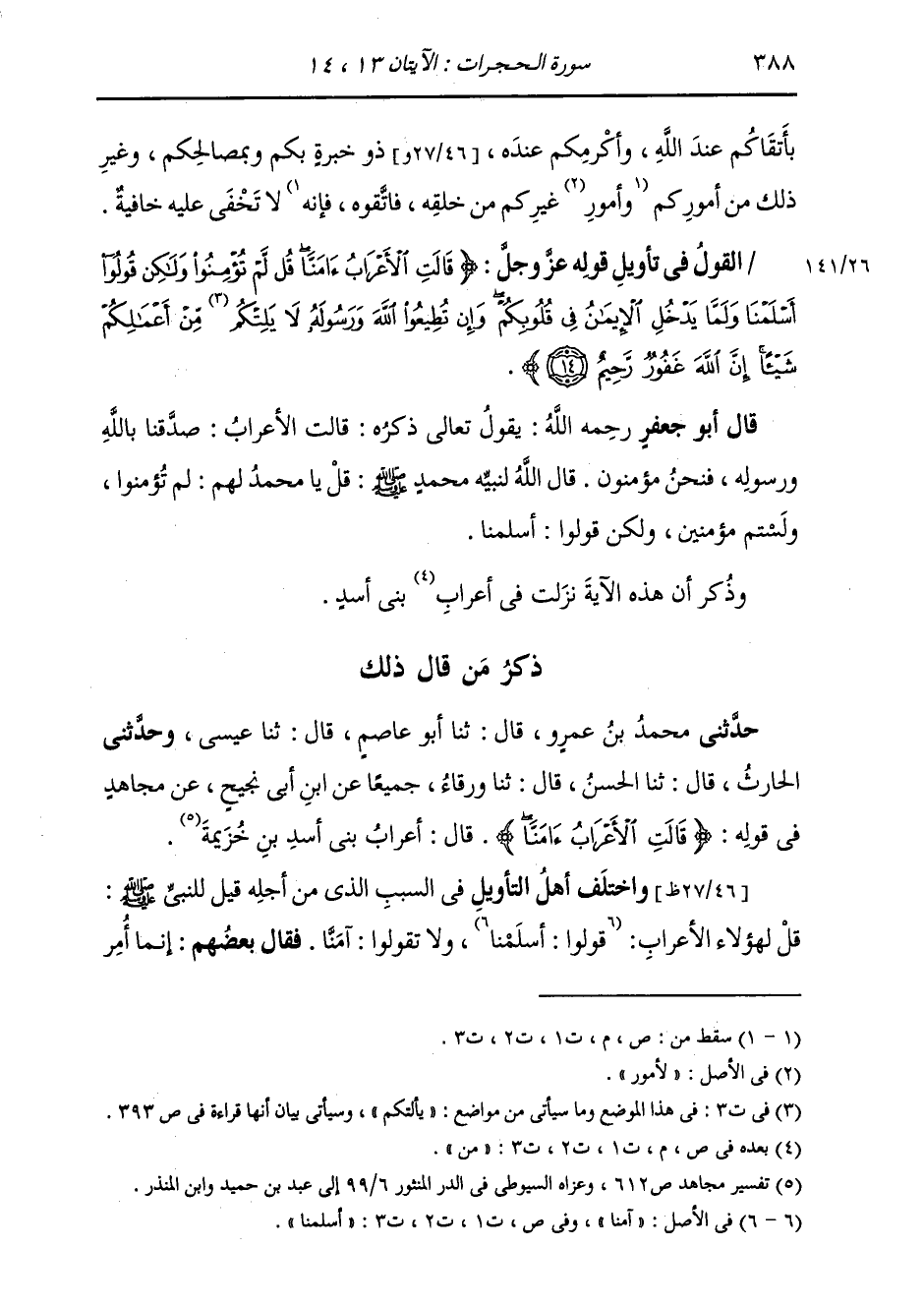 §الْقَوْلُ فِي تَأْوِيلِ قَوْلِهِ تَعَالَى: {قَالَتِ الْأَعْرَابُ آمَنَّا قُلْ لَمْ تُؤْمِنُوا وَلَكِنْ قُولُوا أَسْلَمْنَا وَلَمَّا يَدْخُلِ الْإِيمَانُ فِي قُلُوبِكُمْ وَإِنْ تُطِيعُوا اللَّهَ وَرَسُولَهُ لَا يَلِتْكُمْ مِنْ أَعْمَالِكُمْ شَيْئًا إِنَّ اللَّهَ غَفُورٌ رَّحِيمٌ} [الحجرات: 14] يَقُولُ تَعَالَى ذِكْرُهُ: قَالَتِ الْأَعْرَابُ: صَدَّقْنَا بِاللَّهِ وَرَسُولِهِ، فَنَحْنُ مُؤْمِنُونَ قَالَ اللَّهُ لِنَبِيِّهِ مُحَمَّدٍ صَلَّى اللهُ عَلَيْهِ وَسَلَّمَ: قُلْ يَا مُحَمَّدُ لَهُمْ {لَمْ تُؤْمِنُوا} [الدخان: 21] وَلَسْتُمْ مُؤْمِنِينَ {وَلَكِنْ قُولُوا أَسْلَمْنَا} [الحجرات: 14] وَذُكِرَ أَنَّ هَذِهِ الْآيَةُ نَزَلَتْ فِي أَعْرَابٍ مِنْ بَنِي أَسَدٍ