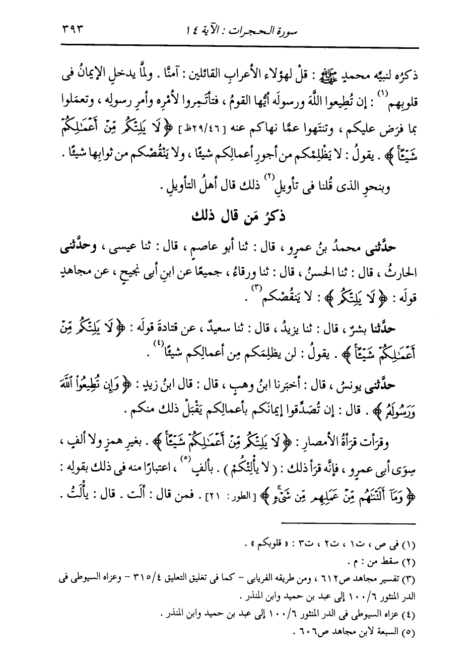 ذِكْرُ مَنْ قَالَ ذَلِكَ: حَدَّثَنِي مُحَمَّدُ بْنُ عَمْرٍو قَالَ: ثَنَا أَبُو عَاصِمٍ قَالَ: ثَنَا عِيسَى، وَحَدَّثَنِي الْحَارِثُ قَالَ: ثَنَا الْحَسَنُ قَالَ: ثَنَا وَرْقَاءُ، جَمِيعًا، عَنِ ابْنِ أَبِي نَجِيحٍ، عَنْ مُجَاهِدٍ، قَوْلَهُ: {§لَا يَلِتْكُمْ} [الحجرات: 14] «لَا يَنْقُصْكُمْ»