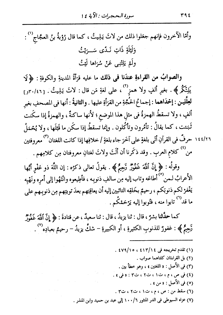 كَمَا: حَدَّثَنَا بِشْرٌ قَالَ: ثَنَا يَزِيدُ قَالَ: ثَنَا سَعِيدٌ، عَنْ قَتَادَةَ، {§إِنَّ اللَّهَ غَفُورٌ رَحِيمٌ} [البقرة: 173] «غَفُورٌ لِلذُّنُوبِ الْكَثِيرَةِ أَوِ الْكَبِيرَةِ، شَكَّ يَزِيدُ، رَحِيمٌ بِعِبَادِهِ»