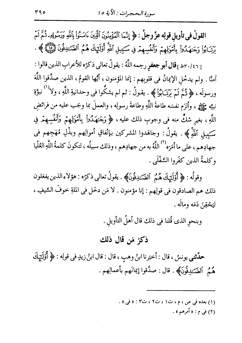§الْقَوْلُ فِي تَأْوِيلِ قَوْلِهِ تَعَالَى: {إِنَّمَا الْمُؤْمِنُونَ الَّذِينَ آمَنُوا بِاللَّهِ وَرَسُولِهِ ثُمَّ لَمْ يَرْتَابُوا وَجَاهَدُوا بِأَمْوَالِهِمْ وَأَنْفُسِهِمْ فِي سَبِيلِ اللَّهِ أُولَئِكَ هُمُ الصَّادِقُونَ} [الحجرات: 15] يَقُولُ تَعَالَى ذِكْرُهُ لِلْأَعْرَابِ الَّذِينَ قَالُوا آمَنَّا وَلَمَّا يَدْخُلِ الْإِيمَانُ فِي قُلُوبِهِمْ: إِنَّمَا الْمُؤْمِنُونَ أَيُّهَا الْقَوْمُ الَّذِينَ صَدَّقُوا اللَّهَ وَرَسُولَهُ، ثُمَّ لَمْ يَرْتَابُوا، يَقُولُ: ثُمَّ لَمْ يَشُكُّوا فِي وَحْدَانِيَّةِ اللَّهِ، وَلَا فِي نُبُوَّةِ نَبِيِّهِ صَلَّى اللهُ عَلَيْهِ وَسَلَّمَ، وَأَلْزَمَ نَفْسَهُ طَاعَةَ اللَّهِ وَطَاعَةَ رَسُولِهِ، وَالْعَمَلَ بِمَا وَجَبَ عَلَيْهِ مِنْ فَرَائِضِ اللَّهِ بِغَيْرِ شَكٍّ مِنْهُ فِي وجُوبِ ذَلِكَ عَلَيْهِ {وَجَاهَدُوا بِأَمْوَالِهِمْ وَأَنْفُسِهِمْ فِي سَبِيلِ اللَّهِ} [الأنفال: 72] يَقُولُ: جَاهَدُوا الْمُشْرِكِينَ بِإِنْفَاقِ أَمْوَالِهِمْ، وَبَذْلِ مُهَجِهِمْ فِي جِهَادِهِمْ، عَلَى مَا أَمَرَهُمُ اللَّهُ بِهِ مِنْ جِهَادِهِمْ، وَذَلِكَ سَبِيلُهُ لِتَكُونَ كَلِمَةُ اللَّهِ الْعُلْيَا، وَكَلِمَةُ الَّذِينَ كَفَرُوا السُّفْلَى