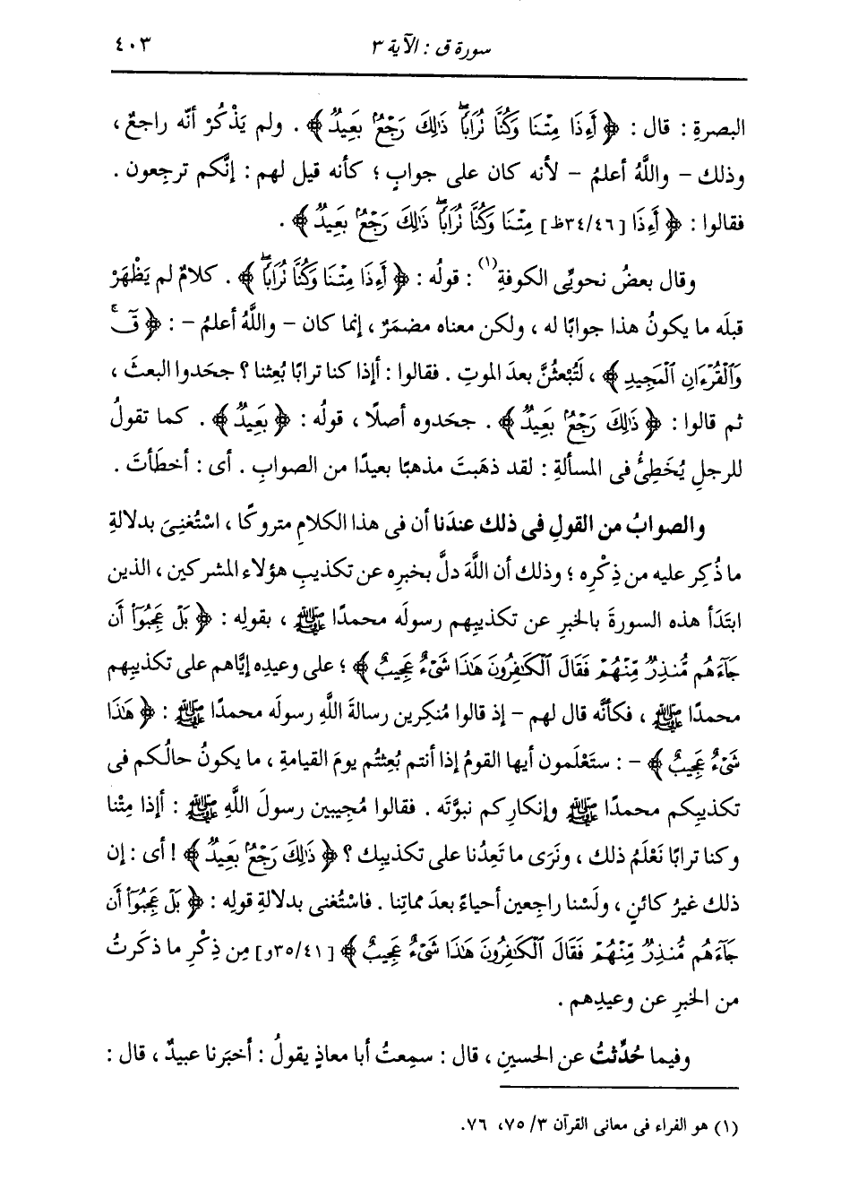 الْبَصْرَةِ قَالَ: {أَئِذَا مِتْنَا وَكُنَّا تُرَابًا ذَلِكَ رَجْعٌ بَعِيدٌ} [ق: 3] ، لَمْ يَذْكُرْ أَنَّهُ رَاجِعٌ، وَذَلِكَ وَاللَّهُ أَعْلَمُ لِأَنَّهُ كَانَ عَلَى جَوَابٍ، كَأَنَّهُ قِيلَ لَهُمْ: إِنَّكُمْ تَرْجِعُونَ، فَقَالُوا: {أَئِذَا مِتْنَا وَكُنَّا تُرَابًا ذَلِكَ رَجْعٌ بَعِيدٌ} [ق: 3] وَقَالَ بَعْضُ نَحْوِيِّي الْكُوفَةِ قَوْلُهُ: {أَئِذَا مِتْنَا وَكُنَّا تُرَابًا} [المؤمنون: 82] كَلَامٌ لَمْ يَظْهَرْ قَبْلَهُ مَا يَكُونُ هَذَا جَوَابًا لَهُ، وَلَكِنْ مَعْنَاهُ مُضْمَرٌ، إِنَّمَا كَانَ وَاللَّهُ أَعْلَمُ: {ق وَالْقُرْآنِ الْمَجِيدِ} [ق: 1] لَتُبْعَثُنَّ بَعْدَ الْمَوْتِ، فَقَالُوا: أَئِذَا كُنَّا تُرَابًا بُعِثْنَا؟ جَحَدُوا الْبَعْثَ، ثُمَّ قَالُوا: {ذَلِكَ رَجْعٌ بَعِيدٌ} [ق: 3] جَحَدُوهُ أَصْلًا، قَوْلَهُ: {بَعِيدٌ} [البقرة: 176] كَمَا تَقُولُ لِلرَّجُلِ يُخْطِئُ فِي الْمَسْأَلَةِ، لَقَدْ ذَهَبْتَ مَذْهَبًا بَعِيدًا مِنَ الصَّوَابِ: أَيْ أَخْطَأْتَ وَالصَّوَابُ مِنَ الْقَوْلِ فِي ذَلِكَ عِنْدَنَا، أَنَّ فِيَ هَذَا الْكَلَامِ مَتْرُوكًا اسْتُغْنِيَ بِدِلَالَةِ مَا ذُكِرَ عَلَيْهِ مِنْ ذِكْرِهِ، وَذَلِكَ أَنَّ اللَّهَ دَلَّ بِخَبَرِهِ عَنْ تَكْذِيبِ هَؤُلَاءِ الْمُشْرِكِينَ الَّذِينَ ابْتَدَأَ هَذِهِ السُّورَةَ بِالْخَبَرِ عَنْ تَكْذِيبِهِمْ رَسُولَهُ مُحَمَّدًا صَلَّى اللهُ عَلَيْهِ وَسَلَّمَ بِقَوْلِهِ: {بَلْ عَجِبُوا أَنْ جَاءَهُمُ مُنْذِرٌ مِنْهُمْ فَقَالَ الْكَافِرُونَ هَذَا شَيْءٌ عَجِيبٌ} [ق: 2] عَلَى وَعِيدِهِ إِيَّاهُمْ عَلَى تَكْذِيبِهِمْ مُحَمَّدًا صَلَّى اللهُ عَلَيْهِ وَسَلَّمَ، فَكَأَنَّهُ قَالَ لَهُمْ: إِذْ قَالُوا مُنْكِرِينَ رِسَالَةَ اللَّهِ رَسُولَهُ مُحَمَّدًا صَلَّى اللهُ عَلَيْهِ وَسَلَّمَ {هَذَا شَيْءٌ عَجِيبٌ} [ق: 2] سَتَعْلَمُونَ أَيُّهَا الْقَوْمُ إِذَا أَنْتُمْ بُعِثْتُمْ يَوْمَ الْقِيَامَةِ مَا يَكُونُ حَالُكُمْ فِي تَكْذِيبِكُمْ مُحَمَّدًا صَلَّى اللهُ عَلَيْهِ وَسَلَّمَ، وَإِنْكَارِكُمْ نُبُوَّتِهِ، فَقَالُوا مُجِيبِينَ رَسُولَ اللَّهِ صَلَّى اللهُ عَلَيْهِ وَسَلَّمَ {أَئِذَا مِتْنَا وَكُنَّا تُرَابًا} [المؤمنون: 82] نَعْلَمُ ذَلِكَ، وَنَرَى مَا تَعِدُنَا عَلَى تَكْذِيبِكَ {ذَلِكَ رَجْعٌ بَعِيدٌ} [ق: 3] : أَيْ أَنَّ ذَلِكَ غَيْرُ كَائِنٍ، وَلَسْنَا رَاجِعِينَ أَحْيَاءً بَعْدَ مَمَاتِنَا، فَاسْتُغْنِي بِدِلَالَةِ قَوْلِهِ: {بَلْ عَجِبُوا أَنْ جَاءَهُمُ مُنْذِرٌ مِنْهُمْ} [ق: 2] فَقَالَ الْكَافِرُونَ {هَذَا شَيْءٌ عَجِيبٌ} [ق: 2]