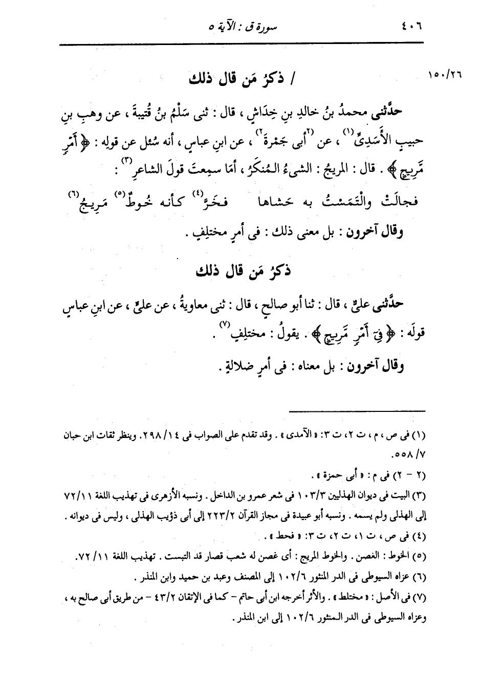 ذَلِكَ: حَدَّثَنِي عَلِيٌّ قَالَ: ثَنَا أَبُو صَالِحٍ قَالَ: ثَنِي مُعَاوِيَةُ، عَنْ عَلِيٍّ، عَنِ ابْنِ عَبَّاسٍ، قَوْلَهُ {§فِي أَمْرٍ مَرِيجٍ} [ق: 5] «يَقُولُ مُخْتَلِفٌ» وَقَالَ آخَرُونَ: بَلْ مَعْنَاهُ: فِي أَمْرِ ضَلَالَةٍ